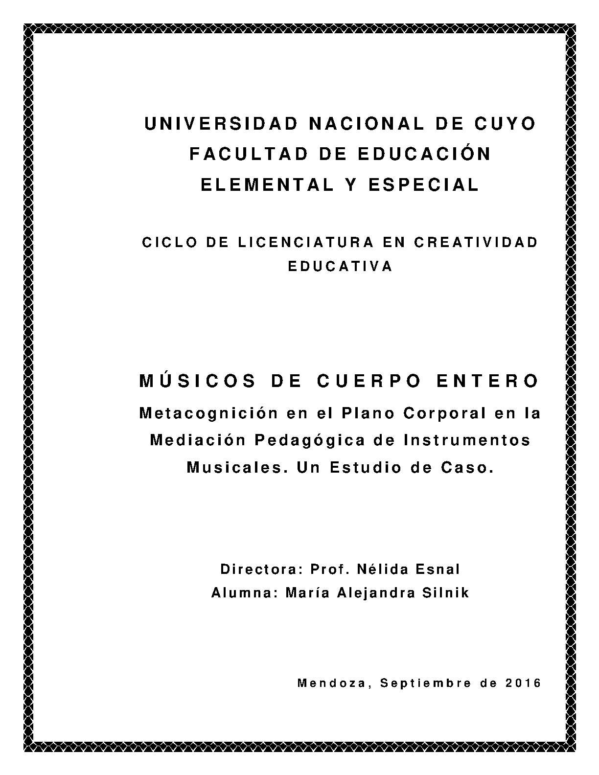 Silnik, María Alejandra. (2016). Músicos de cuerpo entero: metacognición en el plano corporal en la mediación pedagógica de instrumentos musicales: un estudio de caso (Tesina de grado). Mendoza, Universidad Nacional de Cuyo. Facultad de Educación Elemental y Especial .