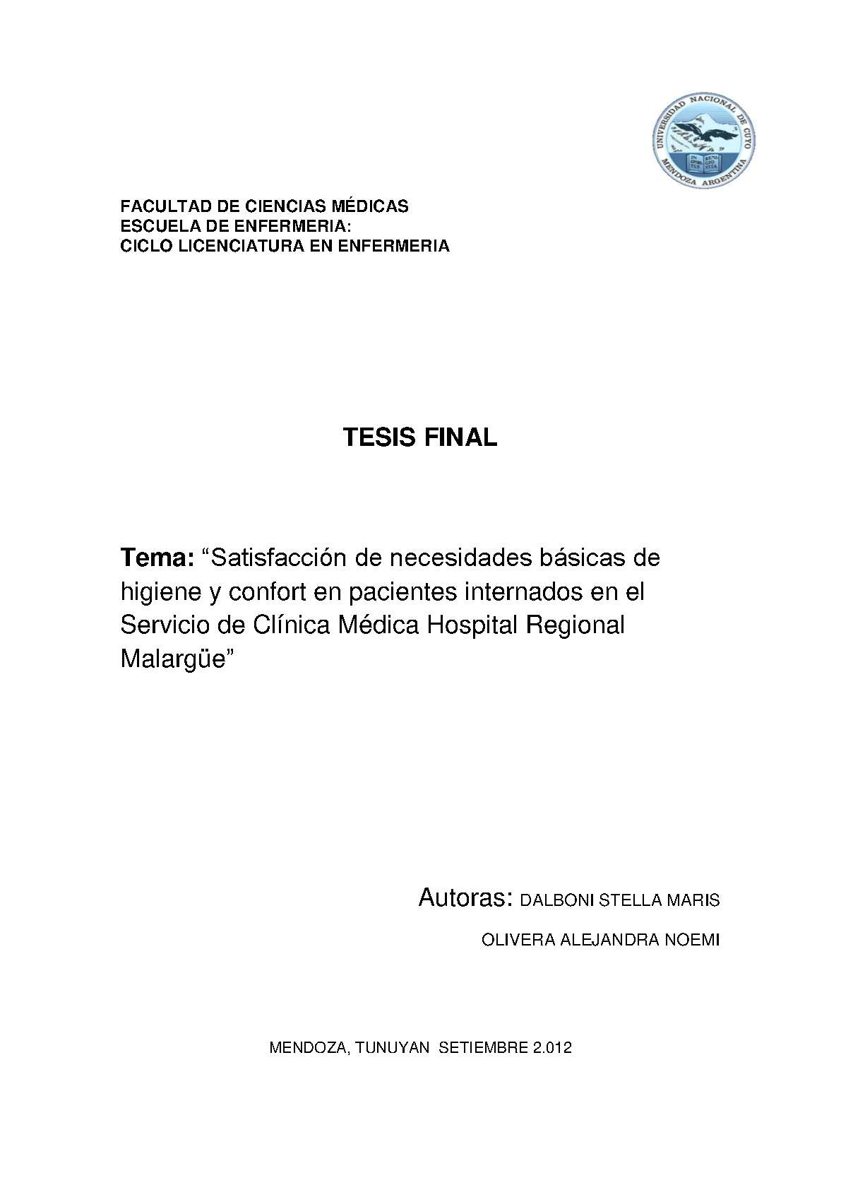 Dalboni, Stella Maris; Olivera, Alejandra Noemí. (2012). Satisfacción de necesidades básicas de higiene y confort en pacientes internados en el servicio de clínica médica, Hospital Regional Malargüe: (Tesina de grado). Mendoza, Universidad Nacional de Cuyo. Facultad de Ciencias Médicas. Escuela de Enfermería..
