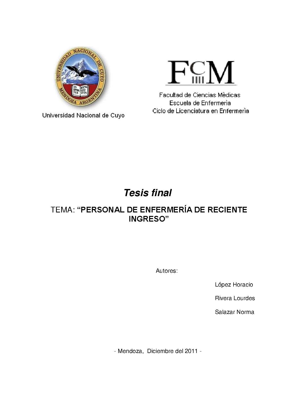 López, Horacio; Rivera, Lourdes; Salazar, Norma. (2011). Personal de enfermería de reciente ingreso: (Tesina de grado). Mendoza, Universidad Nacional de Cuyo. Facultad de Ciencias Médicas. Escuela de Enfermería..