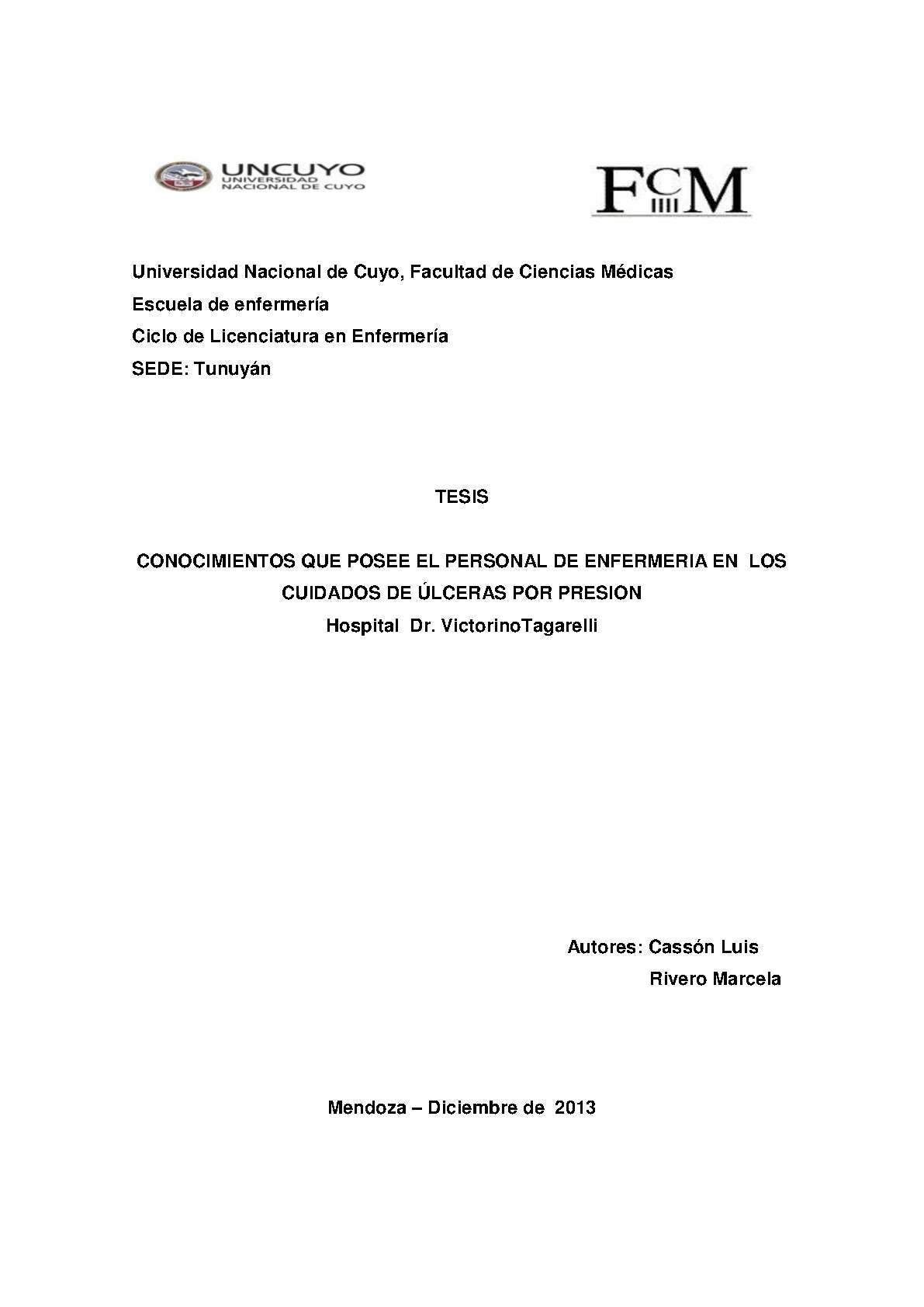 Cassón, Luis; Rivero, Marcela. (2013). Conocimientos que posee el personal de enfermería en los cuidados de úlceras por presión: Hospital Dr. Victorino Tagarelli (Tesina de grado). Mendoza, Universidad Nacional de Cuyo. Facultad de Ciencias Médicas. Escuela de Enfermería..