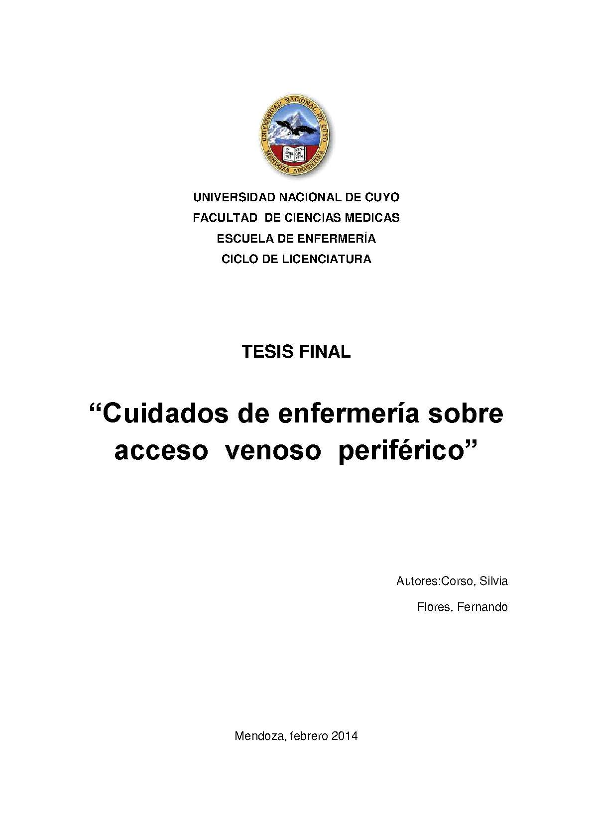 Desde el momento de la internación de un paciente pediátrico y hasta el momento del alta médica, el personal de enfermería está encargado de brindar cuidados y satisfacer la necesidad del dicho paciente. Una de esas necesidades que debe brindar es la integridad cutánea. El acceso venoso periférico es un procedimiento invasivo consistente en la colocación de un catéter en una vena periférica para realizar tratamientos intravenosos de corta duración, administración de medicamentos o sustancias con fines diagnóstico. Al momento de la colocación de estas vías, el personal de enfermería requiere un amplio conocimiento del procedimiento, del equipo necesario y de las técnicas de asepsia en el cuidado, así mismo no debe olvidar la parte anímica del paciente. Pero los cuidados de enfermería al paciente con una vía periférica no solo se limitan a la propia acción de colocar el catéter o seleccionar la vía, sino también es importante dar continuidad a los mismos durante el tiempo que permanezca colocado el catéter, de manera que por medio de la valoración, registro, cambio de apósito, cambio de catéter y limpieza, se brinde seguridad, comodidad y se puedan detectar precozmente posibles complicaciones. El presente trabajo de investigación tiene por objetivo general determinar cuál es el conocimiento y cuidados de enfermería sobre acceso venoso periférico, en el servicio de internación III, del Hospital Dr. Humberto Notti, Mendoza, octubre 2013.