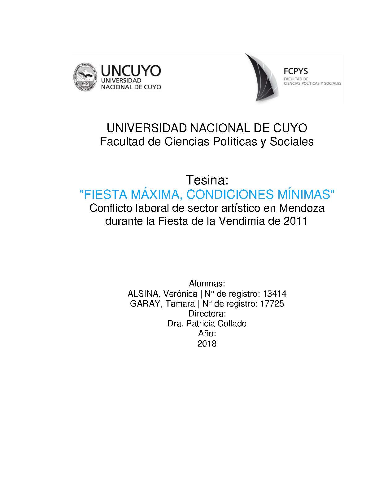 Alsina, Verónica ; Garay, Tamara. (2018). Fiesta máxima, condiciones mínimas: conflicto laboral del sector artístico en Mendoza durante la fiesta nacional de la vendimia del año 2011 (Tesina de grado). Mendoza, Universidad Nacional de Cuyo. Facultad de Ciencias Políticas y Sociales .