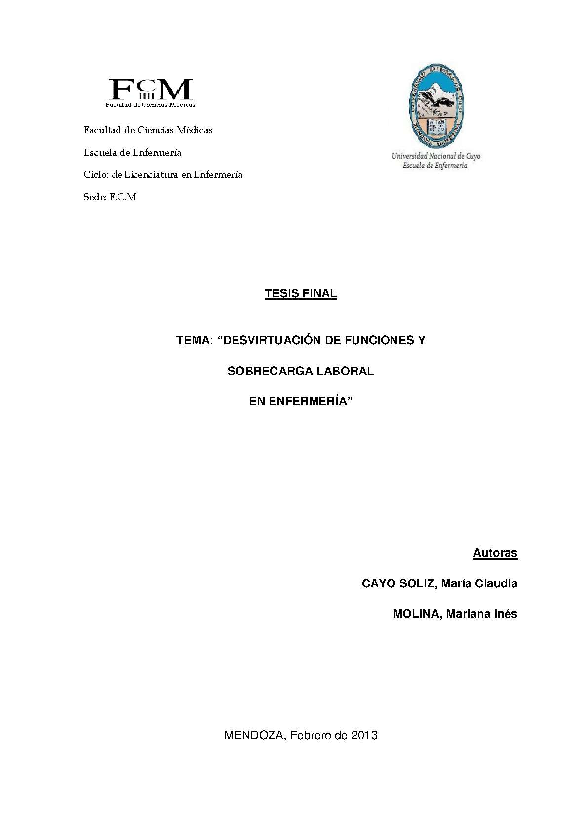 Al llevar a cabo sus actividades, las enfermeras ayudan a individuos, familias y comunidades a fomentar la salud y prevenir enfermedades; satisfacen todas las necesidades del enfermo ayudándolo a la recuperación más completa de su salud, además proporciona comodidad y apoyo en caso de enfermedades incurables. Actualmente el personal de enfermería está a cargo de múltiples funciones complejas; cuida al paciente y se preocupa por él, participa en el diagnóstico y tratamiento de enfermedades, protege a los enfermos de los factores dañinos que pudieran poner en peligro su salud, es asesora y maestra en problemas de salud, coordina las actividades del grupo de enfermería y coopera con diversos profesionales de otras disciplinas. También actúa como vocero y defensor del paciente. Las condiciones de trabajo de las enfermeras se caracterizan por la sobrecarga de trabajo, jornadas extensas, turnos rotatorios, suspensión de francos, trabajo nocturno, frecuentes cambios de servicios, carga psicológica por el manejo de situaciones críticas; sumado esto a las actividades no competentes a esta profesión, tales como tareas administrativas, actividades de movilización y traslado de pacientes, actividades invasivas directas con el paciente propias del profesional médico, mensajería y otras como por ejemplo preparar material para esterilizar; produciendo en el enfermero síntomas de agotamiento emocional, cansancio físico y psicológico, con un sentimiento de ineficacia, por no poder atender como quisiera las tareas a realizar, mostrando falta de compromiso en su trabajo. La falta de tiempo para cumplir todas las tareas exigidas al personal de enfermería, es lo que produce desgaste y estrés en estos profesionales. Este trabajo de investigación tiene como objetivo determinar en qué medida la desvirtuación de funciones, provoca sobrecarga laboral en el personal de enfermería de la Clínica Santa María de Mendoza. Año 2012.