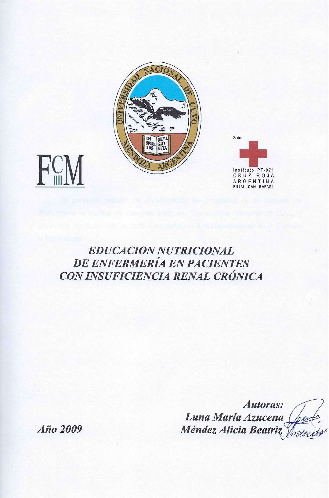 Una alimentación adecuada es fundamental para que los pacientes en hemodiálisis tengan una buena calidad de vida, así como para disminuir su morbimortalidad. En algunos casos las transgresiones dietéticas se realizan conociendo sus posibles consecuencias, pero en otros casos los pacientes incluso las desconocen. Habitualmente enfermería es consciente de la importancia de una buena educación sanitaria de las personas en programa de hemodiálisis, especialmente en lo que concierne a la alimentación. Virginia Henderson definió os cuidados de enfermería como la capacidad de asistir al individuo, enfermo o sano, en la realización de actividades que contribuyen a su salud o a su recuperación, y que él realizaría sin ayuda si dispusiera de la fuerza, voluntad o conocimientos necesarios, de tal forma que le ayude a ser independiente lo antes posible. En la actualidad, una de las funciones relevantes del rol de enfermería es la docente y educadora, realizando promoción y educación para la salud de la población, a través de una potenciación del autocuidado. El inicio del tratamiento sustitutivo produce un gran impacto en el ambiente personal, familiar, laboral y social del paciente con Insuficiencia Renal Crónica (IRC). La información y la educación son los recursos con los cuales se puede favorecer la aceptación de esta nueva situación. Este trabajo de investigación tiene como objetivo determinar cuáles son los conocimientos previos que poseen los pacientes con insuficiencia renal crónica atendidos en el Servicio de Nefrología y Hemodiálisis del Hospital Español del sur, en el departamento de San Rafael, Mendoza sobre la alimentación adecuada en hemodiálisis y sus consecuencias, en mayo 2009.