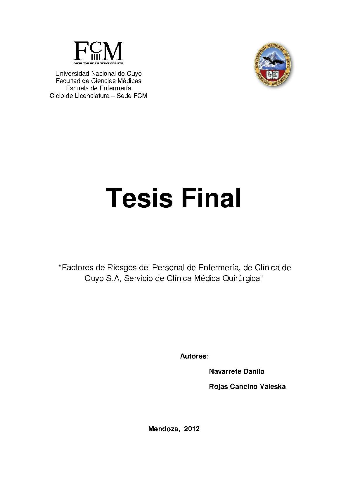 Navarrete, Danilo; Rojas Cancino, Valezca. (2012). Factores de riesgo del personal de enfermería, de Clínica de Cuyo S.A., servicio de Clínica Médica Quirúrgica: (Tesina de grado). Mendoza, Universidad Nacional de Cuyo. Facultad de Ciencias Médicas. Escuela de Enfermería..