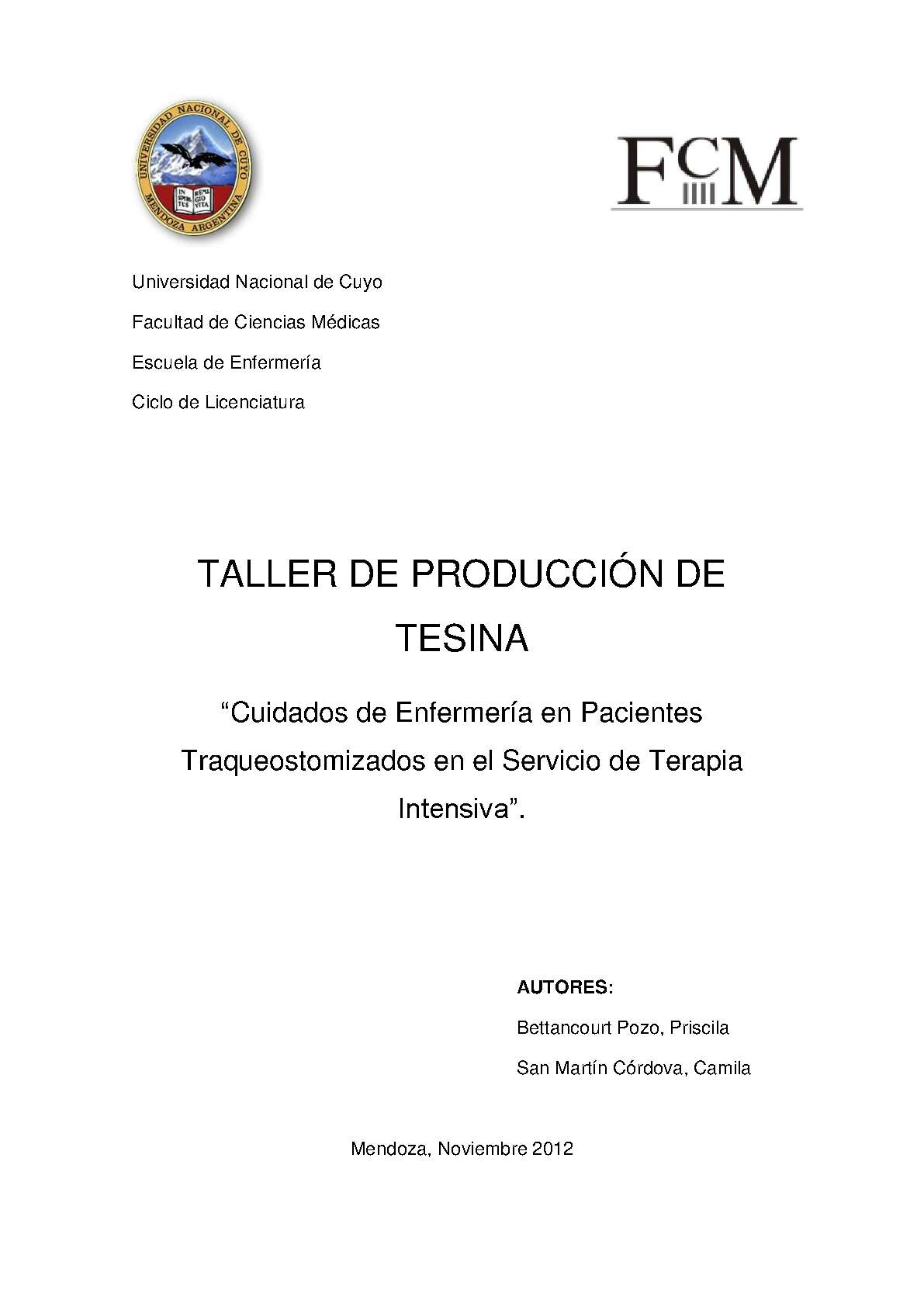 La traqueostomía es una intervención que se realiza con frecuencia en la unidad de terapia intensiva (UTI) y que se define como un procedimiento quirúrgico mediante el cual se crea una vía aérea traqueocutánea a través de una incisión en la región anterior del cuello, específicamente en la zona de la tráquea, a partir de una punción y sucesivas dilataciones en la pared anterior de este órgano, bajo el cartílago cricoides. Su principal objetivo es proporcionar una vía aérea artificial segura. La traqueotomía es una técnica realizada a pacientes críticos los cuales requieren de un tiempo prolongado de ventilación mecánica (VM), y/o compromiso de conciencia con incapacidad de proteger la vía aérea, por lo cual es de vital importancia su correcto manejo. Los principales objetivos con respecto a los cuidados entregados por enfermería son: mantener la vía aérea permeable, prevenir las infecciones respiratorias y mantener la piel circundante del estoma laríngeo en condiciones óptimas. El conocimiento del enfermero se hace fundamental ya que debe estar alerta a indicaciones, contraindicaciones, complicaciones y a las ventajas de la traqueostomía, debido a que debe dar respuestas a las necesidades del paciente y su familia a cada momento. Debido a que estos procedimientos en el paciente pueden ser pasajeros o permanentes, el enfermero/a debe ser capaz de entregar una buena atención y educación al paciente y/o a su familia. Este trabajo de investigación tiene como objetivo establecer si los cuidados de enfermería que se brindan en pacientes traqueostomizados en la unidad de terapia intensiva del Hospital Italiano, desde mayo hasta noviembre del 2012, en Mendoza, Argentina, cumplen los principios de calidad y bioseguridad.