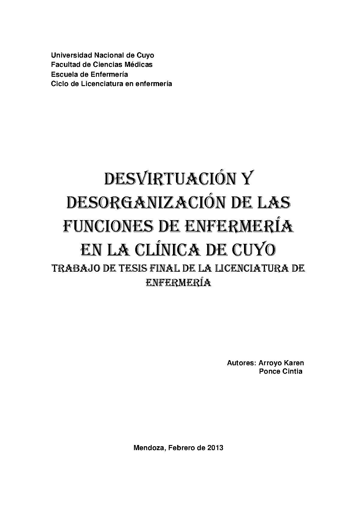 La profesión de enfermería es una disciplina que cumple diversas acciones en el campo de la salud, dirigidas a la atención centrada en el paciente, brindando cuidados específicos y necesarios para que el paciente mejore su estado de salud. Los jefes de enfermería son los encargados de diagramar los turnos del personal y de rotarlos se servicio en caso de ser necesario. Diferentes factores influyen en dicha organización y repercuten directamente en el personal de enfermería. Entre esos factores se puede mencionar: estrés laboral, recarga horaria (cumplimiento de dos turnos seguidos), postergación y/o acortamiento de licencias por falta de personal, incremento de renuncias. A su vez, el personal de enfermería debe cumplir tareas no propias a su profesión, como son: escribir dietas de los pacientes en planillas, verificación del funcionamiento de aparatos no relacionados con la salud del pacientes, llevar o retirar del laboratorio pedidos de análisis urgentes, traslado de pacientes, entre otros. Debido a estos factores y sumados a la falta de comunicación e incorrecta diagramación y distribución del personal por turnos y servicios, se observa un incremento en las renuncias y por ende en la falta de personal. El siguiente trabajo de investigación se basa en el estudio realizado al personal de enfermería del servicio de clínica médica de la Clínica de Cuyo, en Mendoza, Argentina. En él se abordaron temas acerca del rol y las funciones que allí se realizan, determinando cuáles son los factores que desvirtúan dichas funciones y en qué grado afecta al personal la desorganización en el trabajo. También se determinaron las razones por las cuales ha habido un alto porcentaje de renuncias en el periodo de agosto de 2011 a febrero de 2012, y en base a una encuesta realizada, se obtuvieron datos que se representaron mediante gráficos claros y con datos contundentes. La investigación se encuentra avalada por diferentes autores mencionados en la bibliografía por lo que se concluyó que la problemática planteada, en relación a la desvirtuación de funciones de enfermería, no ocurre solamente en la institución sanitaria en la que se realizó, sino que está presente en la mayoría de los hospitales, clínicas o establecimientos sanitarios.