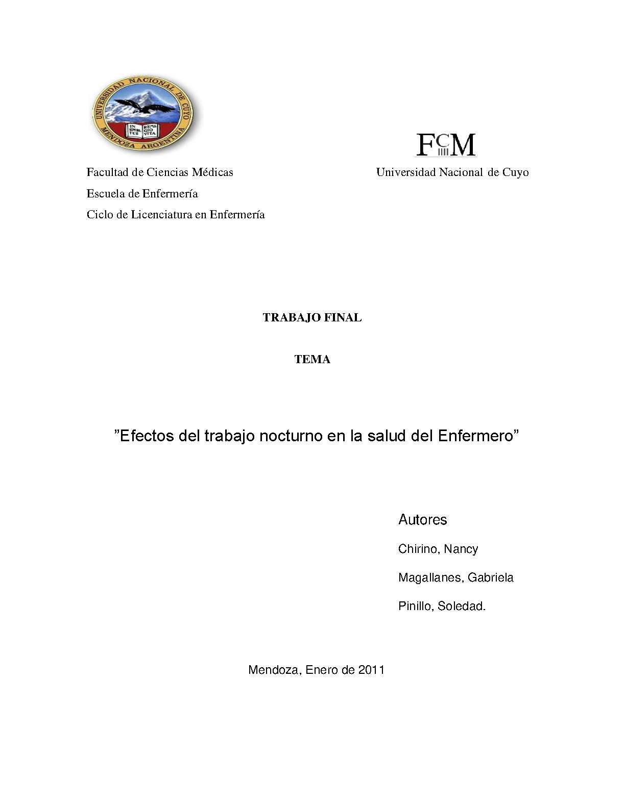 Chirino, Nancy; Magallanes, Gabriela; Pinillo, Soledad. (2011). Efectos del trabajo nocturno en la salud del enfermero: (Tesina de grado). Mendoza, Universidad Nacional de Cuyo. Facultad de Ciencias Médicas. Escuela de Enfermería..