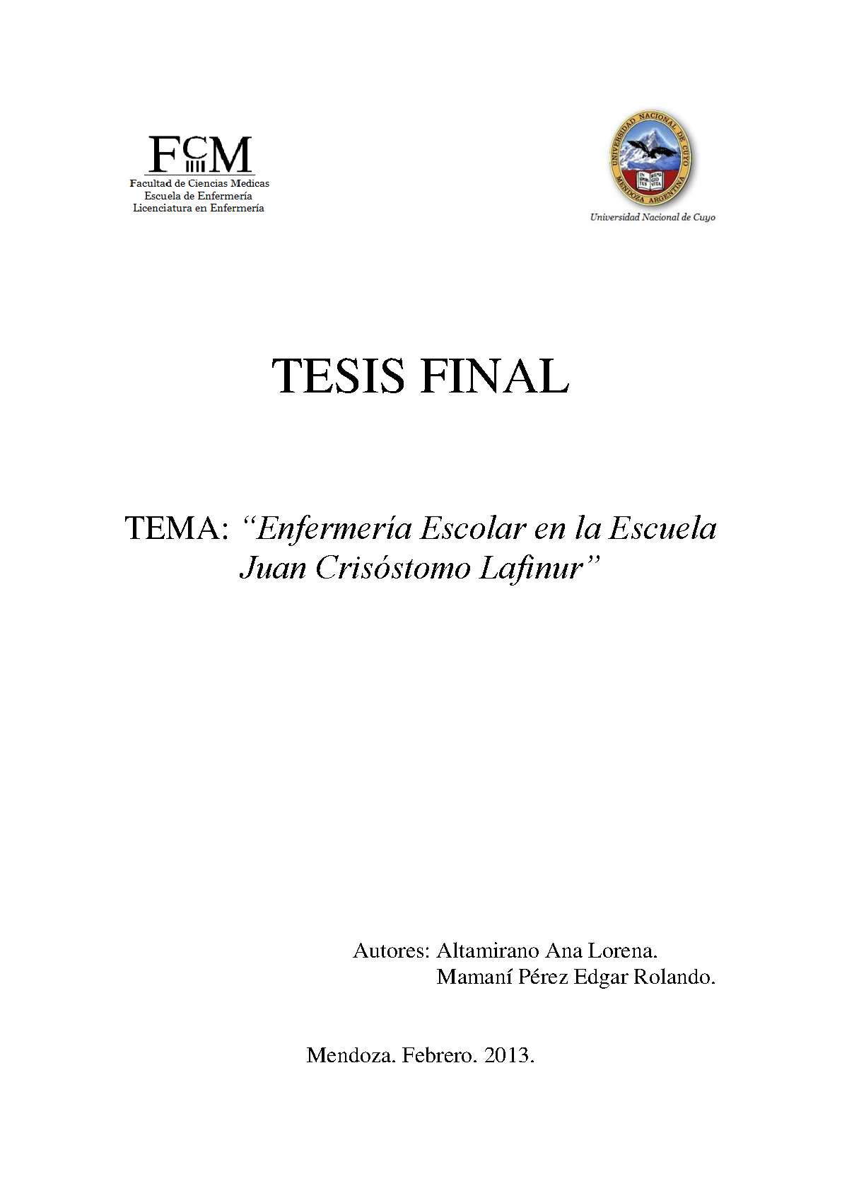 La incorporación de la enfermera escolar involucra la atención socio-sanitaria en niños escolarizados, teniendo como propósito una atención integral que incluya a los alumnos, familiares y cuerpo de docentes, trabajando de manera multidisciplinaria y adecuada. Ubicada dentro del contexto escolar, tratando de que los infantes lleven una vida lo más normalizada posible. La enfermera escolar es una nueva oportunidad que tiene la enfermería, para demostrar que su capacidad y talento pueden actuar de manera conjunta en una comunidad que espera moldear el estilo de vida de los niños en sus distintas etapas, para evitarles enfermedades o accidentes y a su vez propiciando el autocuidado de su salud con el fin de brindarles un futuro mejor durante sus distintas etapas de desarrollo. Es así mismo una forma innovadora de atención a los alumnos, donde participan los perfiles profesionales y sus familias, facilitando una mejor calidad de vida durante su desarrollo en forma integral y personalizada, garantizando el respeto y la dignidad de su autonomía. Este trabajo de investigación tiene como objetivo establecer en qué medida la demanda de cuidados de salud de la comunidad escolar de la Escuela nº1-095 Juan Crisóstomo Lafinur, perteneciente al distrito de Fray Luis Beltrán, departamento de Maipú, provincia de Mendoza estaría satisfecha en gran medida con la incorporación de la enfermería escolar durante el período del mes de agosto de 2012.