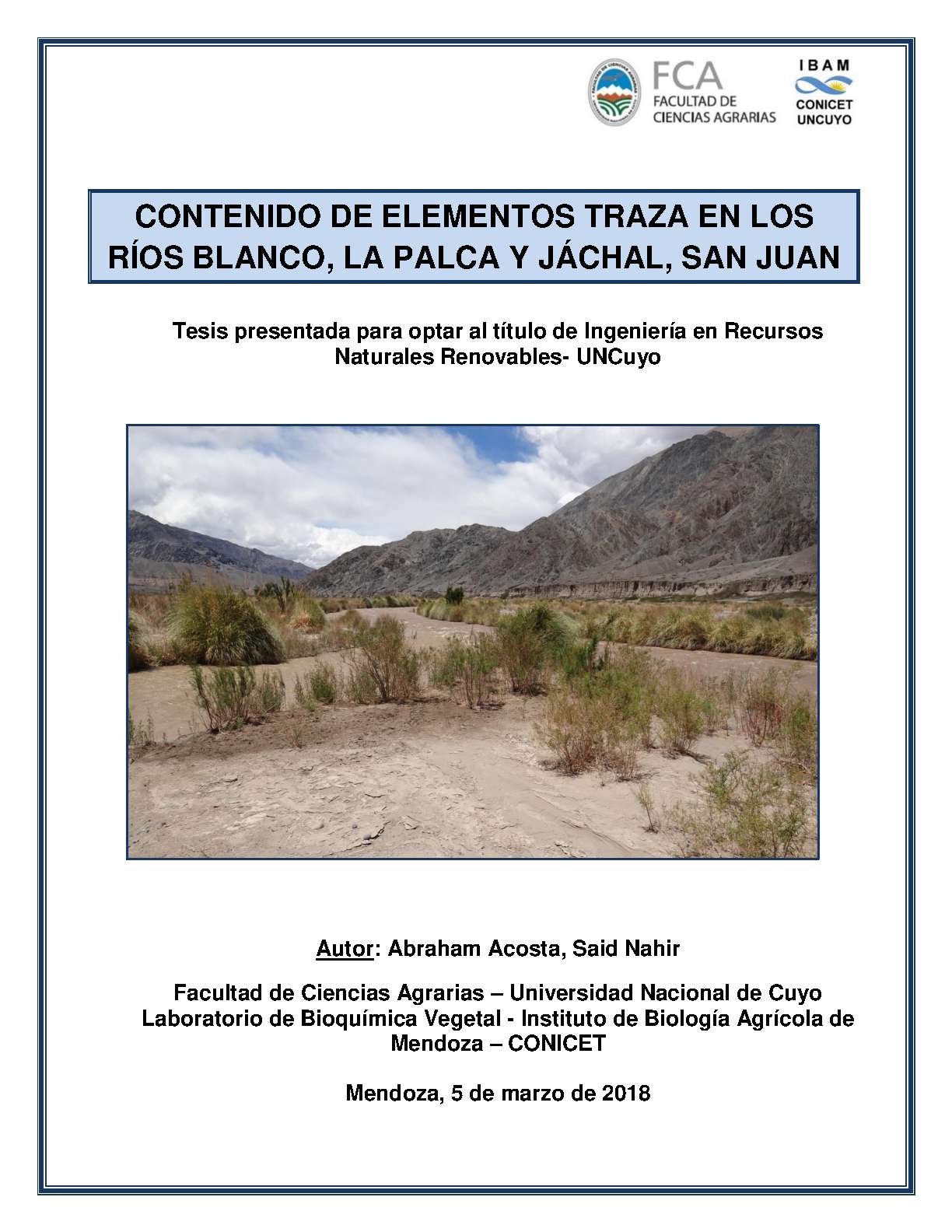 RÍOS - CUENCAS HIDROGRÁFICAS - OLIGOELEMENTOS - RÍO JÁCHAL (SAN JUAN, ARGENTINA) - RÍO BLANCO (SAN JUAN, ARGENTINA) - RÍO LA PALCA (SAN JUAN, ARGENTINA) - ANÁLISIS QUÍMICO - FACTORES AMBIENTALES - METALES PESADOS - METALES ALCALINOTÉRREOS - CÓDIGO ALIMENTARIO DEL ORGANISMO PARA EL CONTROL DE ALIMENTOS Y MEDICAMENTOS - RECURSOS DEL SUELO