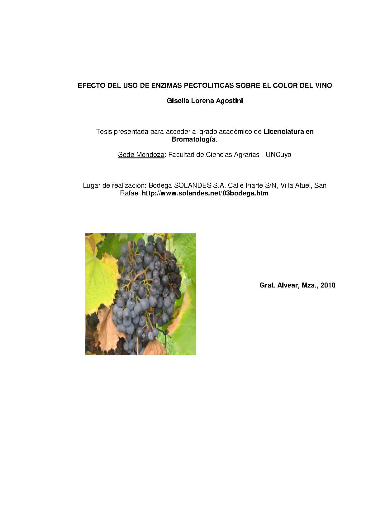 Agostini, Gisella Lorena. (2018). Efecto del uso de enzimas pectolíticas sobre el color del vino: (Tesina de grado). Mendoza, Universidad Nacional de Cuyo. Facultad de Ciencias Agrarias .
