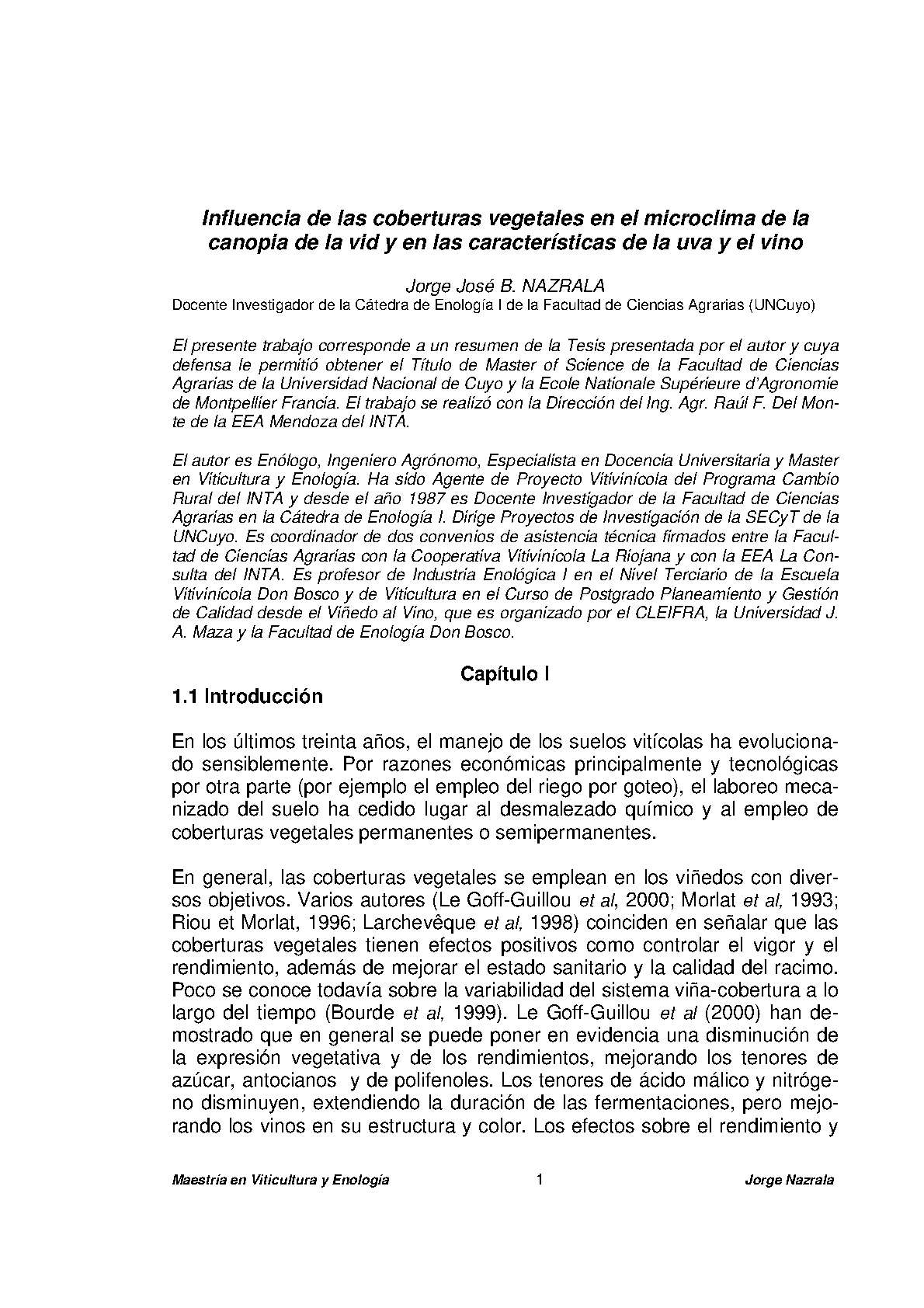 Nazrala, Jorge José Bautista. (2004). Influencia de las coberturas vegetales en el microclima de la canopia de la vid y en las características de la uva y el vino: (Tesis de Maestría). Mendoza, Universidad Nacional de Cuyo. Facultad de Ciencias Agrarias , École Nationale Supérieure Agronomique (Montpellier, Francia).