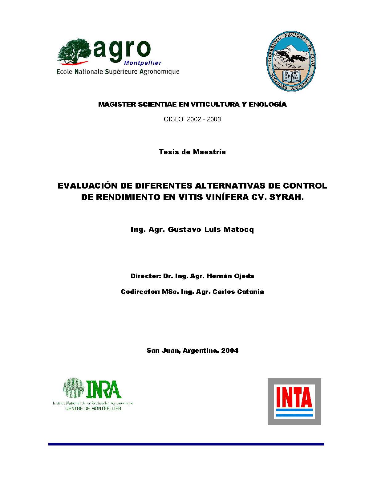 Matocq, Gustavo Luis. (2004). Evaluación de diferentes alternativas de control de rendimiento en Vitis vinifera cv. Syrah: (Tesis de Maestría). Mendoza, Universidad Nacional de Cuyo. Facultad de Ciencias Agrarias , École Nationale Supérieure Agronomique (Montpellier, Francia).