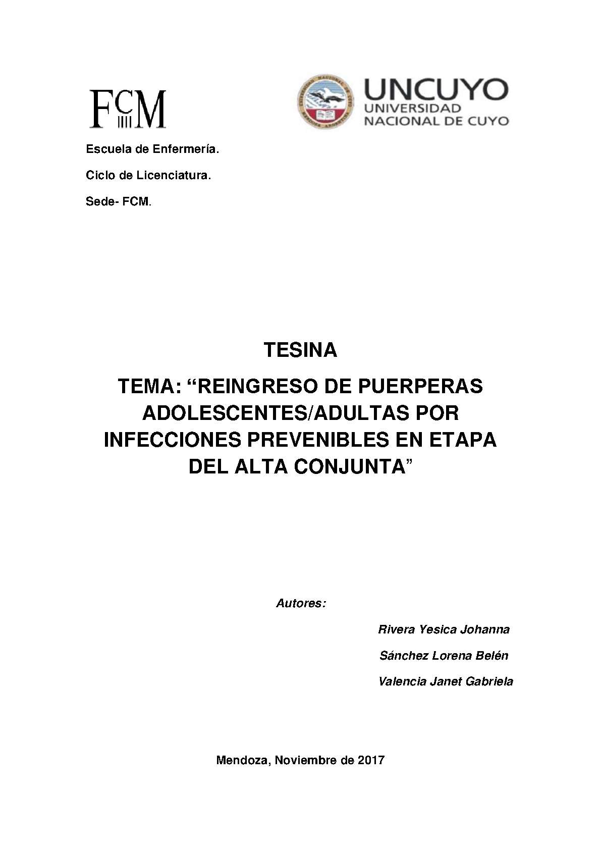 Lugar de estudio: Hospital Lagomaggiore, Servicio 1er y 3er piso Maternidad, periodo mayo, junio, julio y agosto del año 2017.