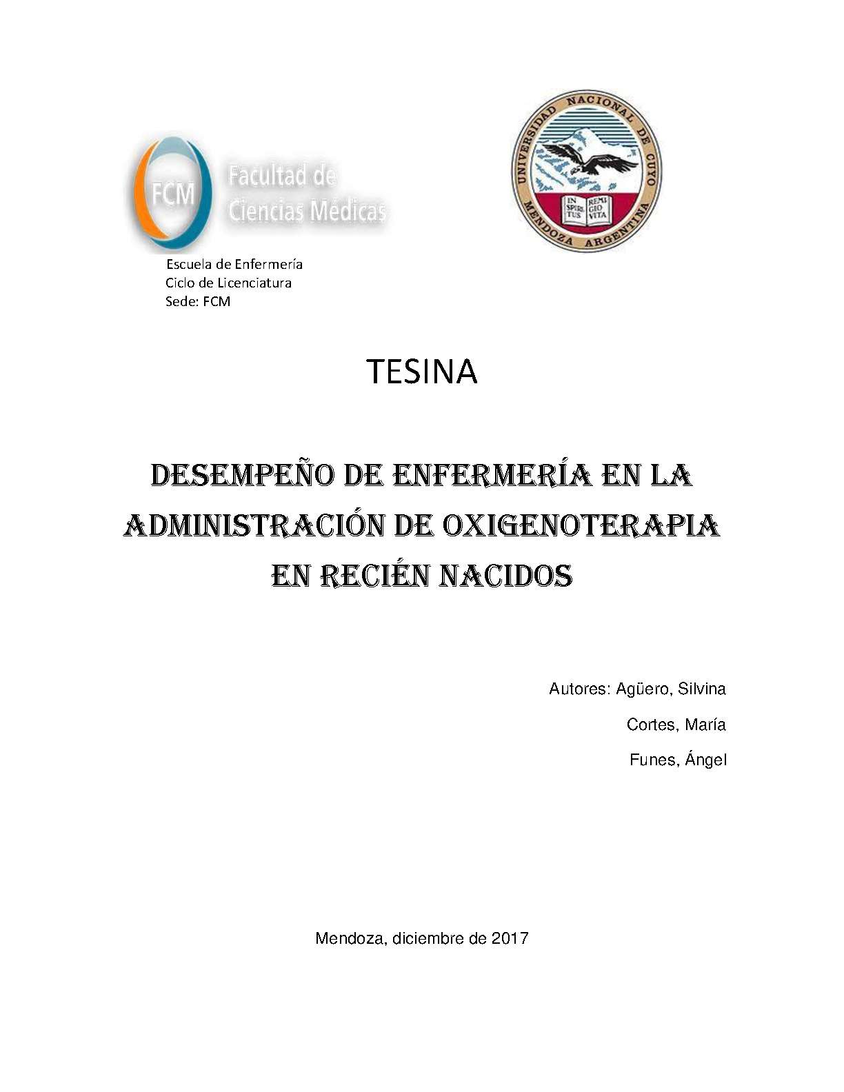 Agüero, Silvina; Cortés, María; Funes, Ángel. (2018). Desempeño de enfermería en la administración de oxigenoterapia en recién nacidos: (Tesina de grado). Mendoza, Universidad Nacional de Cuyo. Facultad de Ciencias Médicas. Escuela de Enfermería..