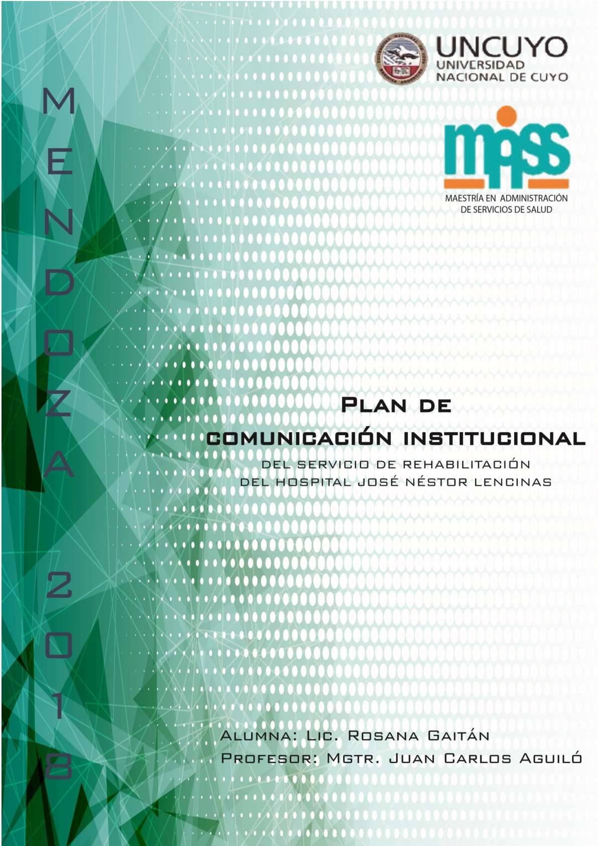 The present work has been carried out with the objective of responding, through an Institutional Communication Plan, to the communicational needs of the Rehabilitation Service of the Hospital José Néstor Lencinas, located in the Department of Godoy Cruz, in the province of Mendoza.