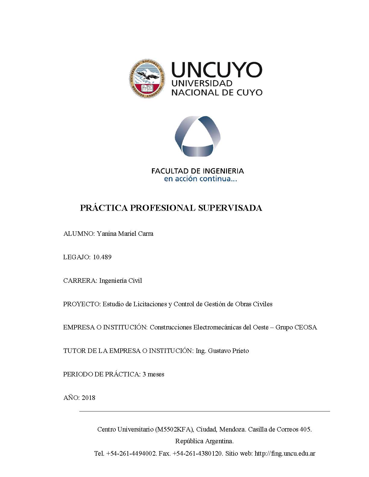 Carra, Yanina Mariel. (2018). Estudio de licitaciones y control de gestión de obras civiles: (Práctica Profesional Supervisada). Mendoza, Universidad Nacional de Cuyo. Facultad de Ingeniería .