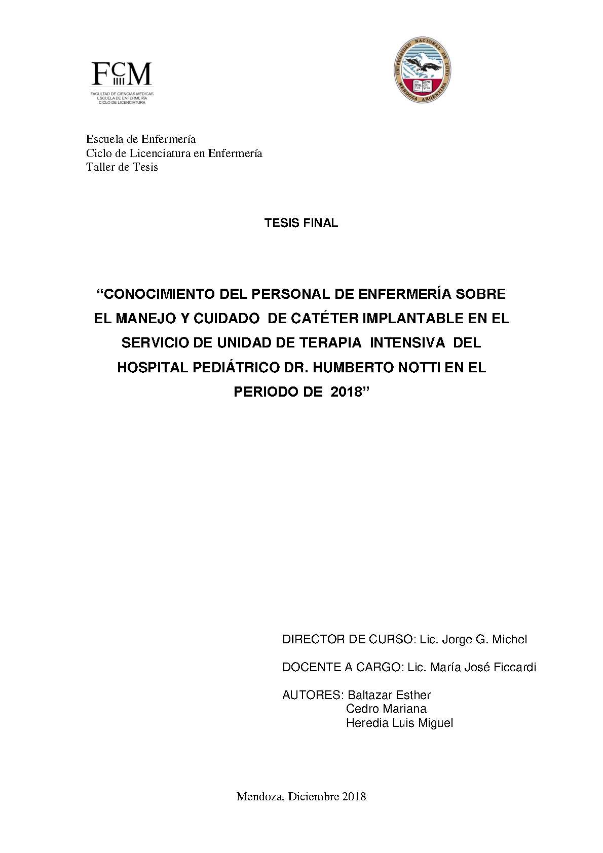 Baltazar, Esther; Cedro, Mariana; Heredia, Luis Miguel. (2019). Conocimiento del personal de enfermería sobre el manejo y cuidado de catéter implantable en el Servicio de Unidad de Terapia Intensiva del Hospital Pediátrico Dr. Humberto Notti en el periodo de 2018: (Tesina de grado). Mendoza, Universidad Nacional de Cuyo. Facultad de Ciencias Médicas. Escuela de Enfermería..