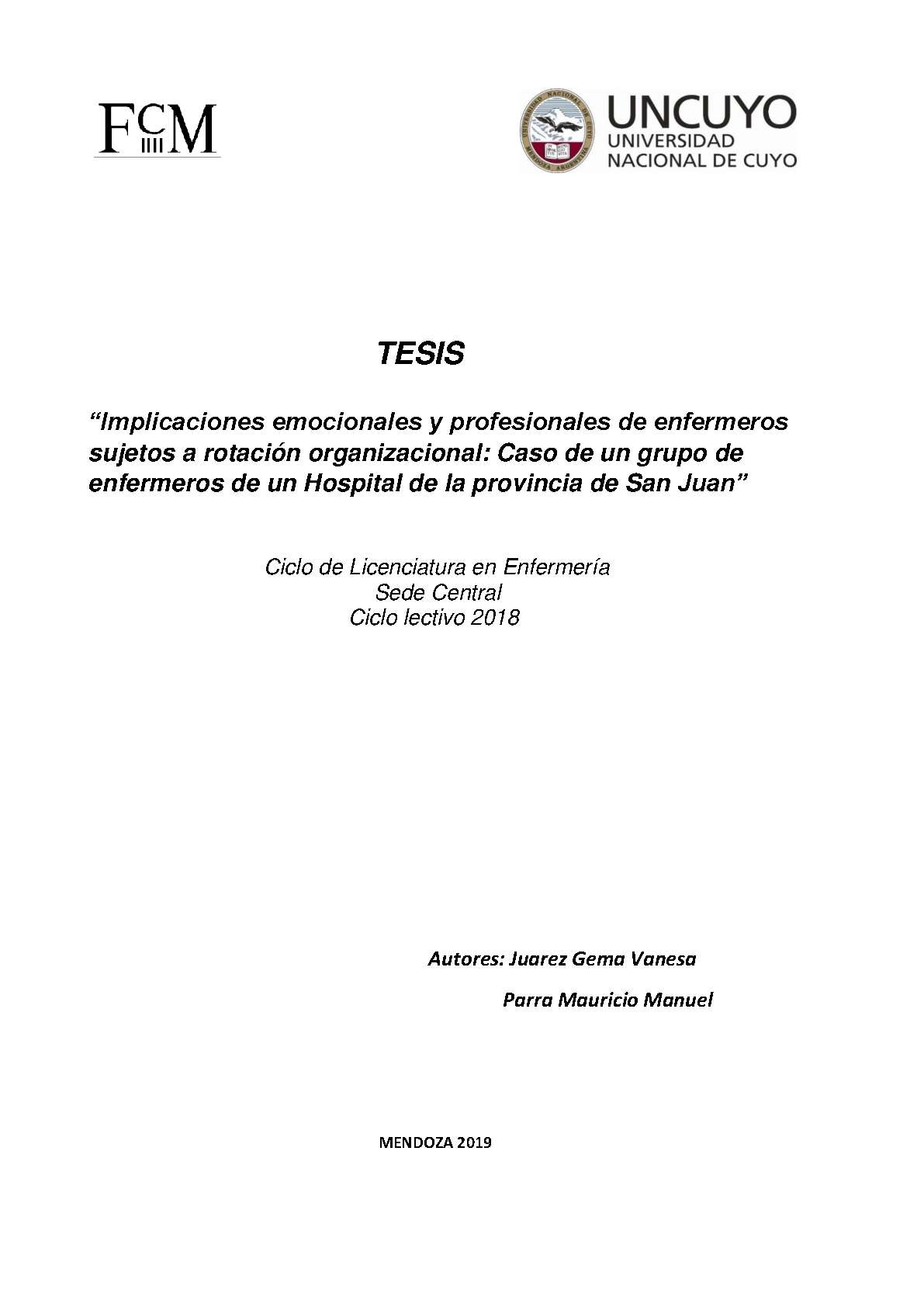 REORGANIZACIÓN DEL PERSONAL - PERSONAL DE ENFERMERÍA - SALUD LABORAL - ROTACIÓN DEL PERSONAL - CONDICIONES DE TRABAJO - AMBIENTE DE TRABAJO - ESTRÉS LABORAL - RENDIMIENTO LABORAL - SAN JUAN (ARGENTINA)