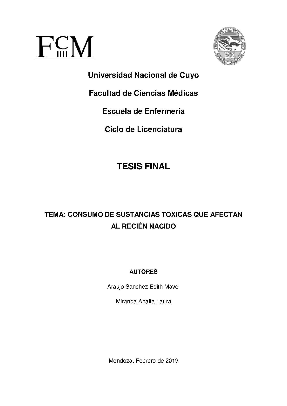 RECIÉN NACIDO - SUSTANCIAS TÓXICAS - MUJERES EMBARAZADAS - CONSUMIDORES DE DROGAS - TRASTORNOS RELACIONADOS CON SUSTANCIAS - FACTORES DE RIESGO - DROGADICCIÓN - ABUSO DE DROGAS/COMPLICACIONES - SÍNDROME DE ABSTINENCIA NEONATAL - HOSPITAL LUIS LAGOMAGGIORE (MENDOZA, ARGENTINA)