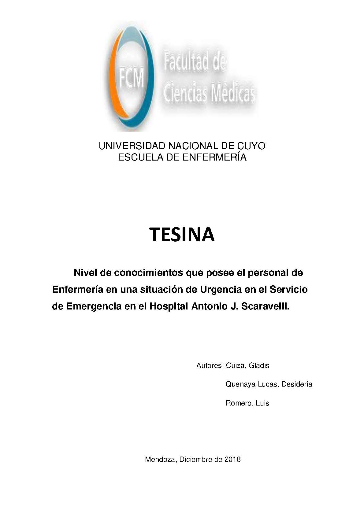 Cuiza, Gladis; Quenaya Lucas, Desideria; Romero, Luis. (2018). Nivel de conocimientos que posee el personal de enfermería en una situación de urgencia en el servicio de emergencia en el Hospital Antonio J. Scaravelli.: (Tesina de grado). Mendoza, Universidad Nacional de Cuyo. Facultad de Ciencias Médicas. Escuela de Enfermería..