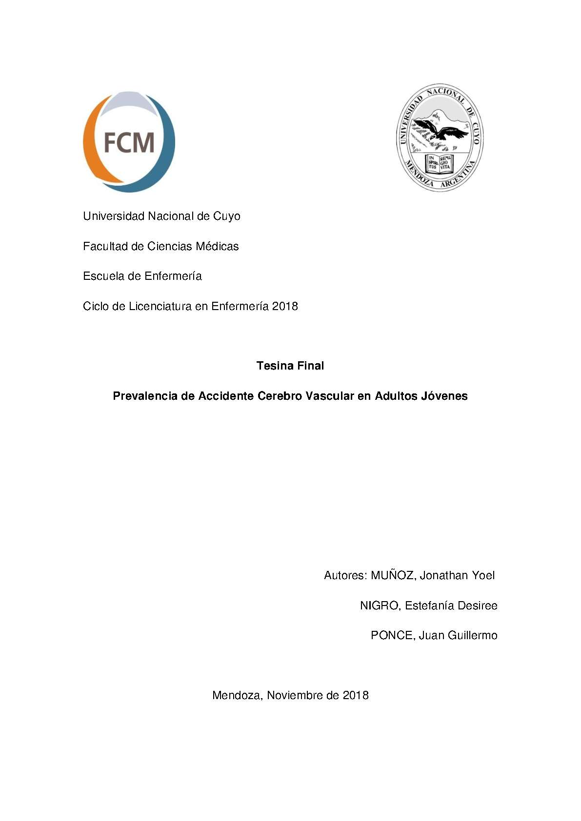 ACCIDENTE CEREBROVASCULAR - ACV - DERRAME CEREBRAL - ATAQUE CEREBRAL - APOPLEJÍA - ADULTO JOVEN - ROL DE LA ENFERMERA - ROL PROFESIONAL - PREVALENCIA - HOSPITAL CENTRAL (MENDOZA, ARGENTINA)