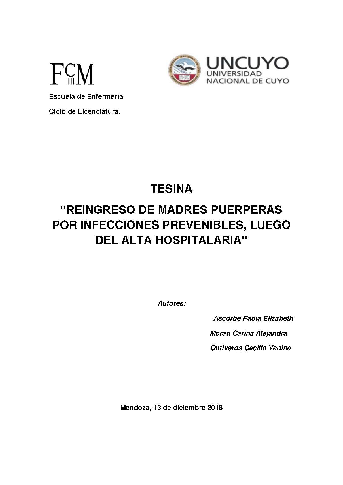 Es por eso que la atención especializada antes, durante y después del parto puede salvarles la vida a embarazadas. La inadecuada compresión sobre los cuidados durante el puerperio, luego del alta hospitalaria, aumenta la cantidad de madres hospitalizadas y evita muertes maternas por complicaciones prevenibles. En esta investigación se tratarán de complejizar temas relacionados con las posibles complicaciones que pueden llegar a tener las madres puérperas (como son infecciones de herida quirúrgica, mastitis, endometritis). Además se tratarán los cuidados que deben tener en cuenta al momento del alta hospitalaria. Así también se destacará el rol de enfermería que debe llevar a cabo el personal para asegurar el cuidado propio de la madre en su puerperio. Este estudio se llevó a cabo en el servicio de maternidad del primer piso del Hospital Luis Lagomaggiore, y tiene como objetivo analizar si las madres puérperas comprenden al momento del alta, las recomendaciones de cuidados que deben llevar a cabo en el hogar, para evitar complicaciones, proporcionadas por personal de dicho servicio durante su estadía en la institución entre los meses de setiembre y octubre del 2018.