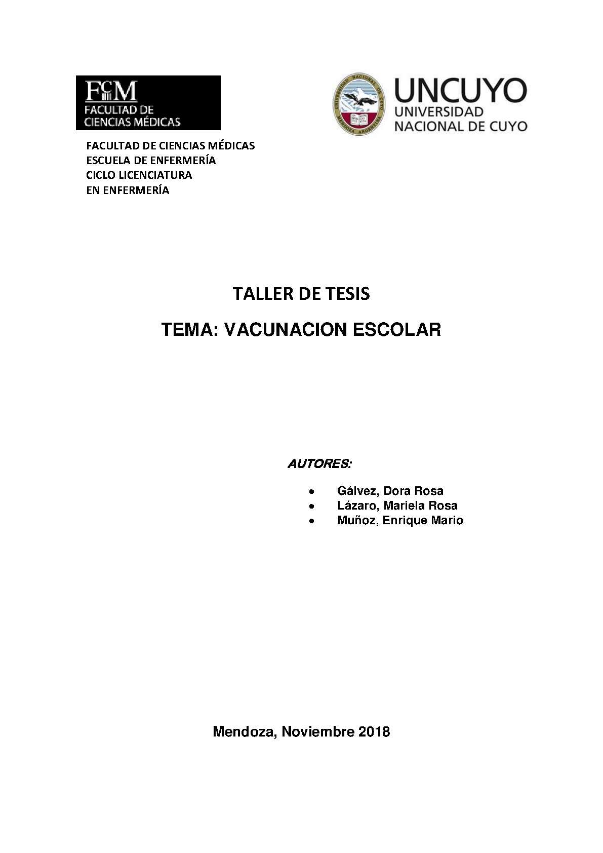Gálvez, Dora Rosa; Lázaro, Mariela Rosa; Muñoz, Enrique Mario. (2018). Vacunación escolar: (Tesina de grado). Mendoza, Universidad Nacional de Cuyo. Facultad de Ciencias Médicas. Escuela de Enfermería..