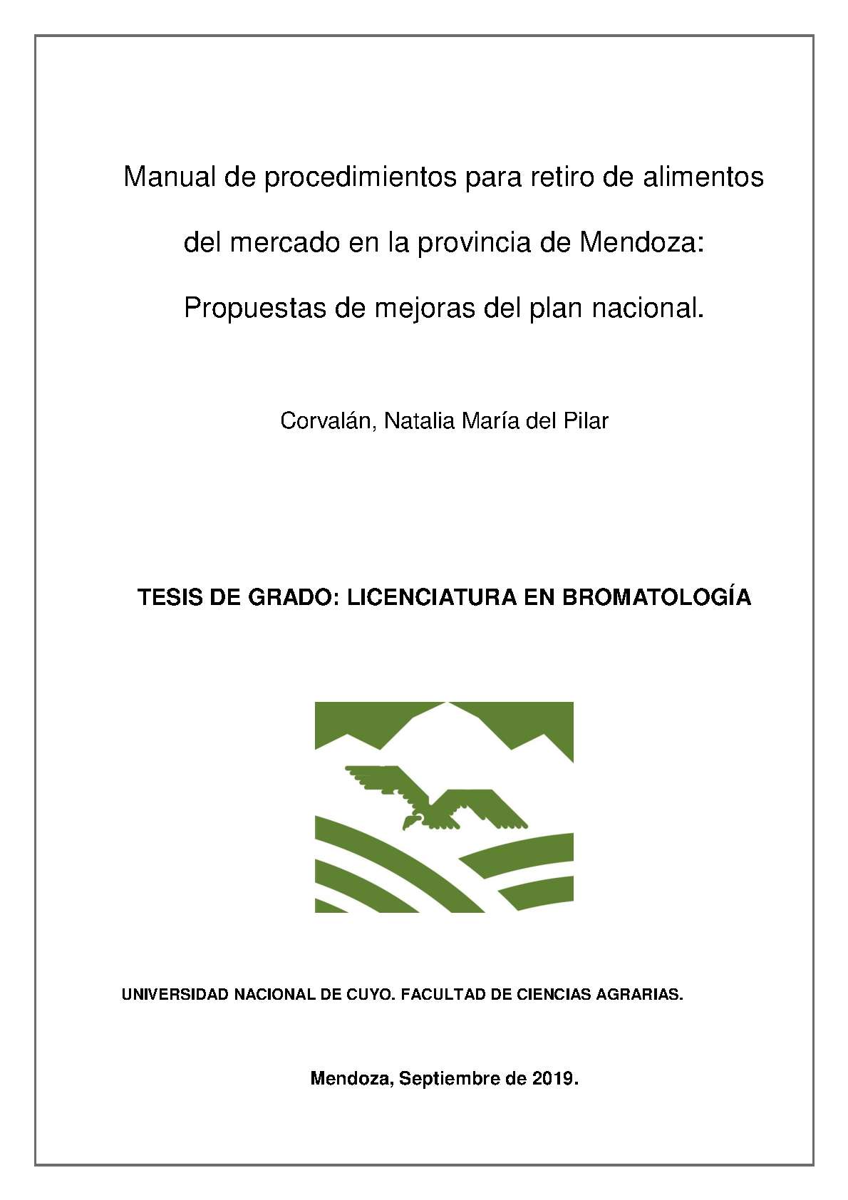 Tanto la autoridad sanitaria provincial de Mendoza como los establecimientos que poseen registro nacional de establecimiento emitido por dicha autoridad, no disponen de un manual de procedimientos para el retiro de alimentos del mercado en la provincia. Este trabajo busca ante todo contribuir a resolver el problema que presentan los establecimientos agroalimentarios y las autoridades sanitarias encargadas de la aplicación de la ley 18.284 en la provincia de Mendoza, a la hora de realizar un retiro de alimentos del mercado. El objetivo general del presente trabajo fue elaborar un manual que oriente, armonice y unifique criterios técnicos, que estandarice procedimientos y defina responsabilidades durante un incidente alimentario, que determine el retiro de alimentos del mercado, dentro del marco legal que especifica el Código Alimentario Argentino en el ámbito de la Provincia de Mendoza. El mismo se desarrolló por fases, en el cual se realizó un diagnóstico mediante encuestas telefónicas a los responsables de calidad y/o producción de los establecimientos productores de alimentos de una muestra seleccionada, para conocer la situación real sobre las prácticas de retiro de alimentos del mercado en la provincia de Mendoza. Para el desarrollo de investigación se utilizaron fuentes de información primaria y secundaria como: encuestas, observación directa, bibliografía, página web, documentos internos y externos sobre el retiro de alimentos del mercado. En base a todos los hallazgos y consultas se identificaron los lineamientos que debería contener el manual. Finalmente se logró la versión final del manual para los establecimientos agroalimentarios y para la autoridad sanitaria. Dicho manual permitirá gestionar adecuadamente los retiros de alimentos del mercado y minimizar los peligros asociados a la inocuidad del producto.