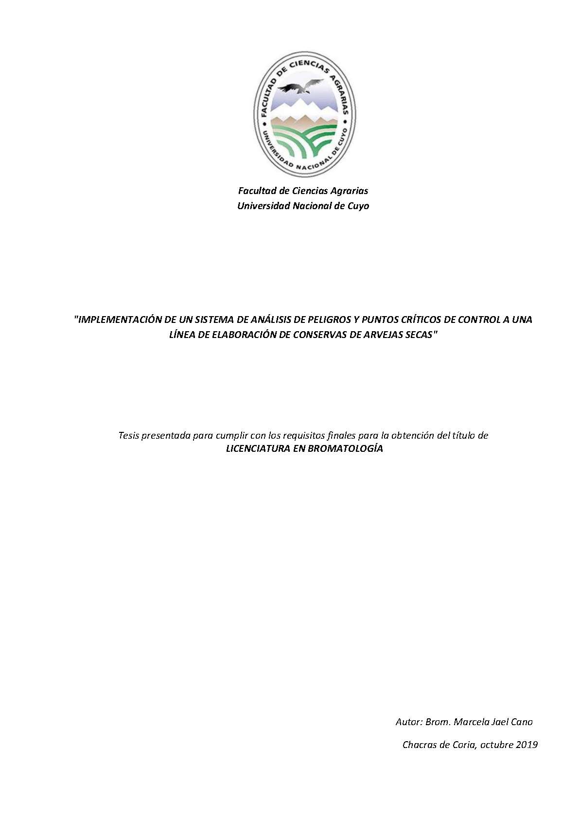 Cano, Marcela Jael. (2019). Implementación de un sistema de análisis de peligros y puntos críticos de control a una línea de elaboración de conservas de arvejas secas: (Tesina de grado). Mendoza, Universidad Nacional de Cuyo. Facultad de Ciencias Agrarias .