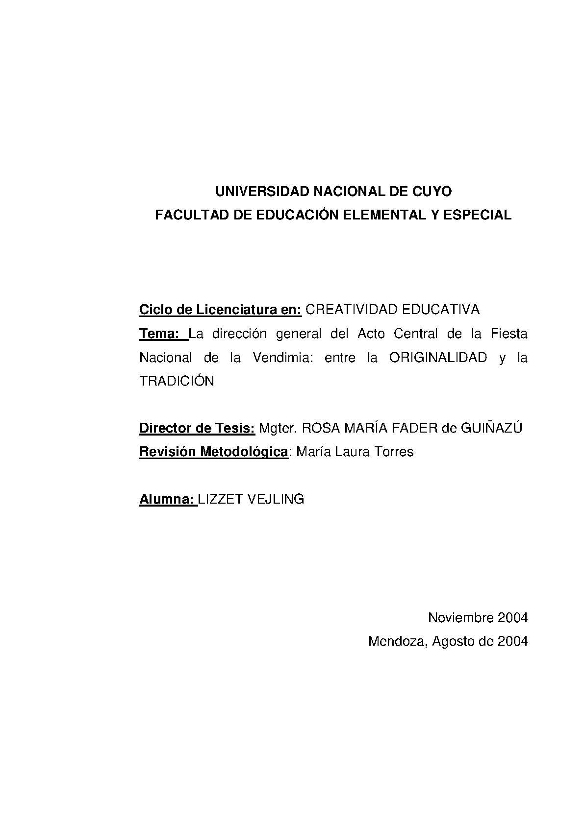 Vejling, Lizzet. (2004). La dirección general del acto central de la Fiesta Nacional de la Vendimia: entre la originalidad y la tradición (Tesina de grado). Mendoza, Universidad Nacional de Cuyo. Facultad de Educación Elemental y Especial .