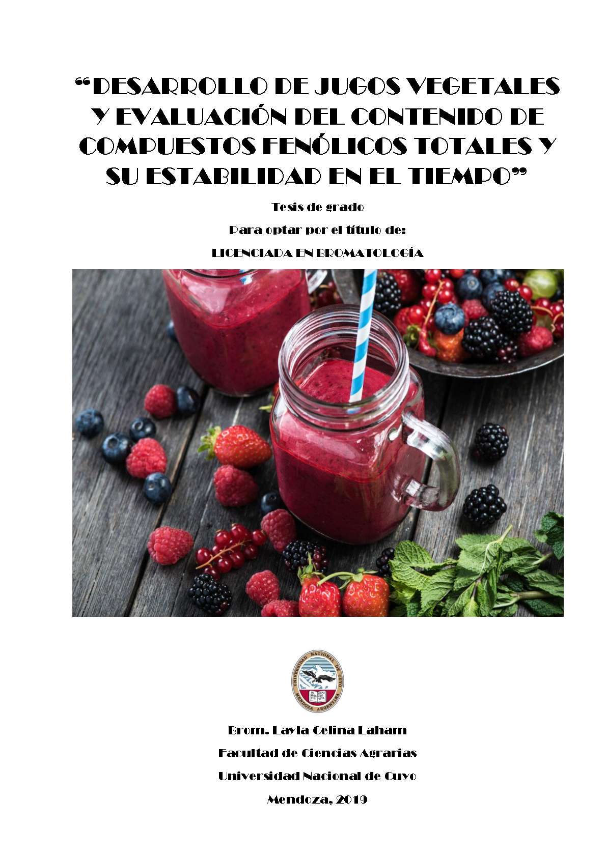 Laham, Layla Celina. (2019). Desarrollo de jugos vegetales y evaluación del contenido de compuestos fenólicos totales y su estabilidad en el tiempo: (Tesina de grado). Mendoza, Universidad Nacional de Cuyo. Facultad de Ciencias Agrarias .