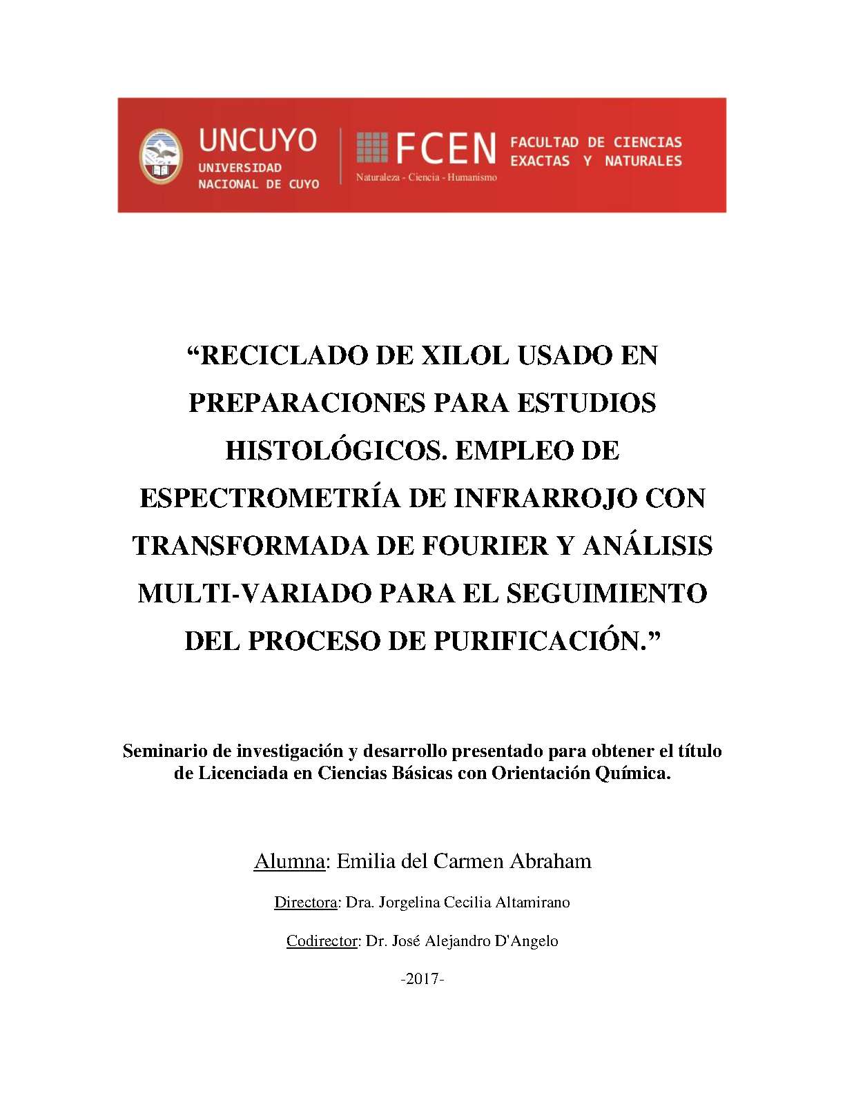 Ante esta situación, el Laboratorio de química ambiental del IANIGLA toma la iniciativa de poner a punto un tratamiento de purificación de xilol, para lo cual se realizaron pruebas piloto satisfactorias. Para aseguramiento del proceso de purificación y evaluación de la calidad del xilol resultante, se requería contar con un seguimiento analítico instrumental y análisis estadístico, lo cual fue el objeto de estudio del presente seminario de investigación. En este sentido, se evaluaron comparativamente dos posibles métodos de purificación de xilol, los cuales se basaron en la técnica de centrifugación y la destilación fraccionada, respectivamente. El seguimiento a lo largo del proceso de purificación se efectuó por medio de análisis mediante espectrometría de infrarrojo por transformada de Fourier (FT-IR). El estudio y la validación de los datos obtenidos, se basó en el análisis estadístico multivariado de componentes principales (PCA), y análisis de la varianza (ANOVA). El PCA fue utilizado como herramienta estadística para la evaluación integral de los resultados. El ANOVA permitió determinar si los resultados obtenidos mediante las metodologías aplicadas mostraban diferencias significativas, y seleccionar aquella con la cual se pudiera lograr una mejor purificación del xilol.