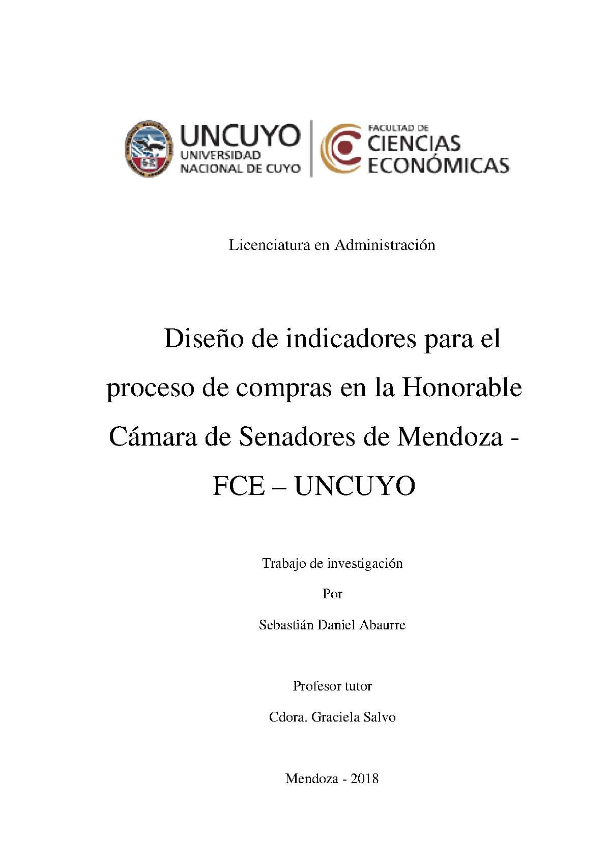 Abaurre, Sebastián Daniel. (2018). Diseño de indicadores para el proceso de compras en la Honorable Cámara de Senadores de Mendoza - FCE – UNCUYO: (Tesina de grado). Mendoza, Universidad Nacional de Cuyo. Facultad de Ciencias Económicas.