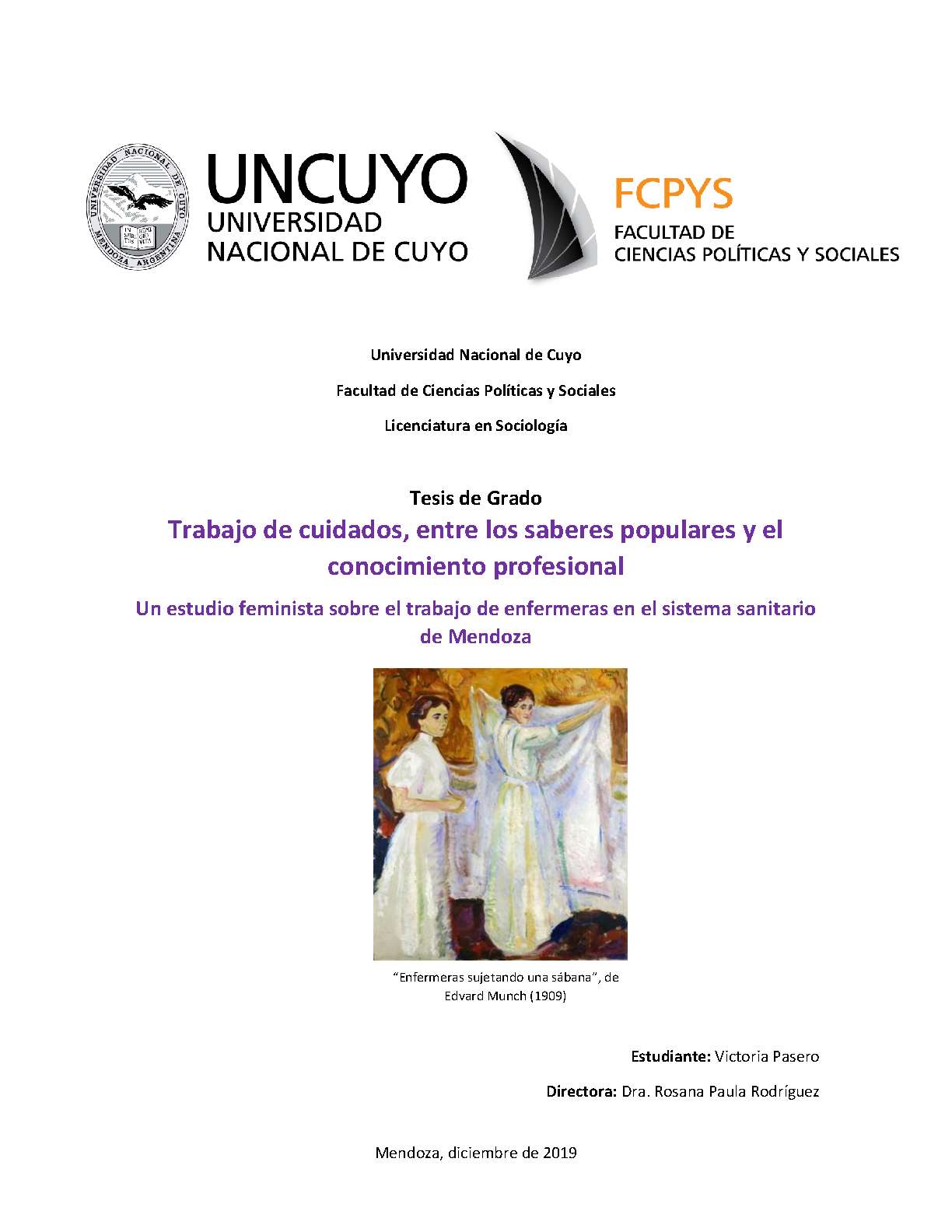 El tema de investigación que aborda esta tesis es el trabajo de cuidados que realizan enfermeras del sistema sanitario de la provincia de Mendoza. Se parte de la consideración del trabajo de cuidado de las enfermeras en el modelo médico hegemónico como una producción histórica enmarcada en prácticas de poder y relaciones sociales sexo-genéricas.