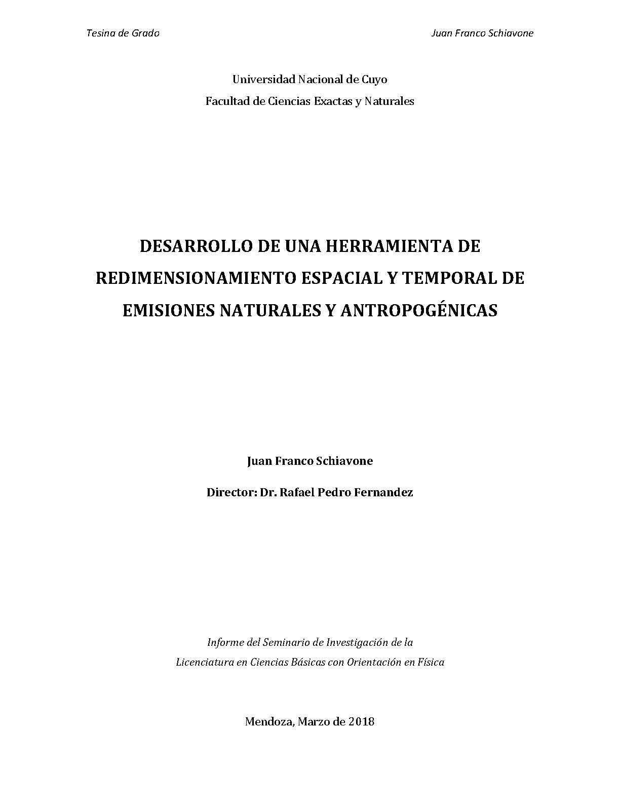 En este trabajo se presenta el desarrollo de una herramienta de redimensionamiento espacial y temporal de emisiones naturales y antropogénicas orientada a adaptar diversos tipos de inventarios de emisión a los requisitos técnicos del modelo regional WRF- Chem. Dicha herramienta, permite reestructurar espacialmente cualquier inventario de emisión, ya sea local (resolución espacial entre 0,5 km y 5 km) o global (resolución espacial entre 50 km y 250 km) a cualquier dominio de WRF-Chem previamente definido por el usuario (incluyendo dominios anidados con resolución espacial entre 5 km y 50 km). Además, la herramienta brinda la posibilidad de modificar el perfil temporal de los inventarios de emisión para fuentes naturales y antropogénicas al introducir una variación horaria de flujo superficial, considerando campos políticos y geofísicos de la tierra y el océano sobre mapas de alta resolución. Como parte del Seminario de Investigación final de grado se realizó la adaptación de dos inventarios globales, uno de emisiones oceánicas naturales (CAM-Chem) y otro de emisiones antropogénicas vehiculares (EDGAR), en un dominio regional anidado sobre América del Sur (con resolución espacial de 36x36, 12x12 y 4x4 km2 ). Junto con ello, se llevó a cabo una comparación de los resultados obtenidos para la base de datos global EDGAR v4.2 (0,1°x0,1°), respecto de un inventario local de emisiones vehiculares de gases de efecto invernadero para Argentina con resolución de 2,5x2,5 km2 (GEAA).