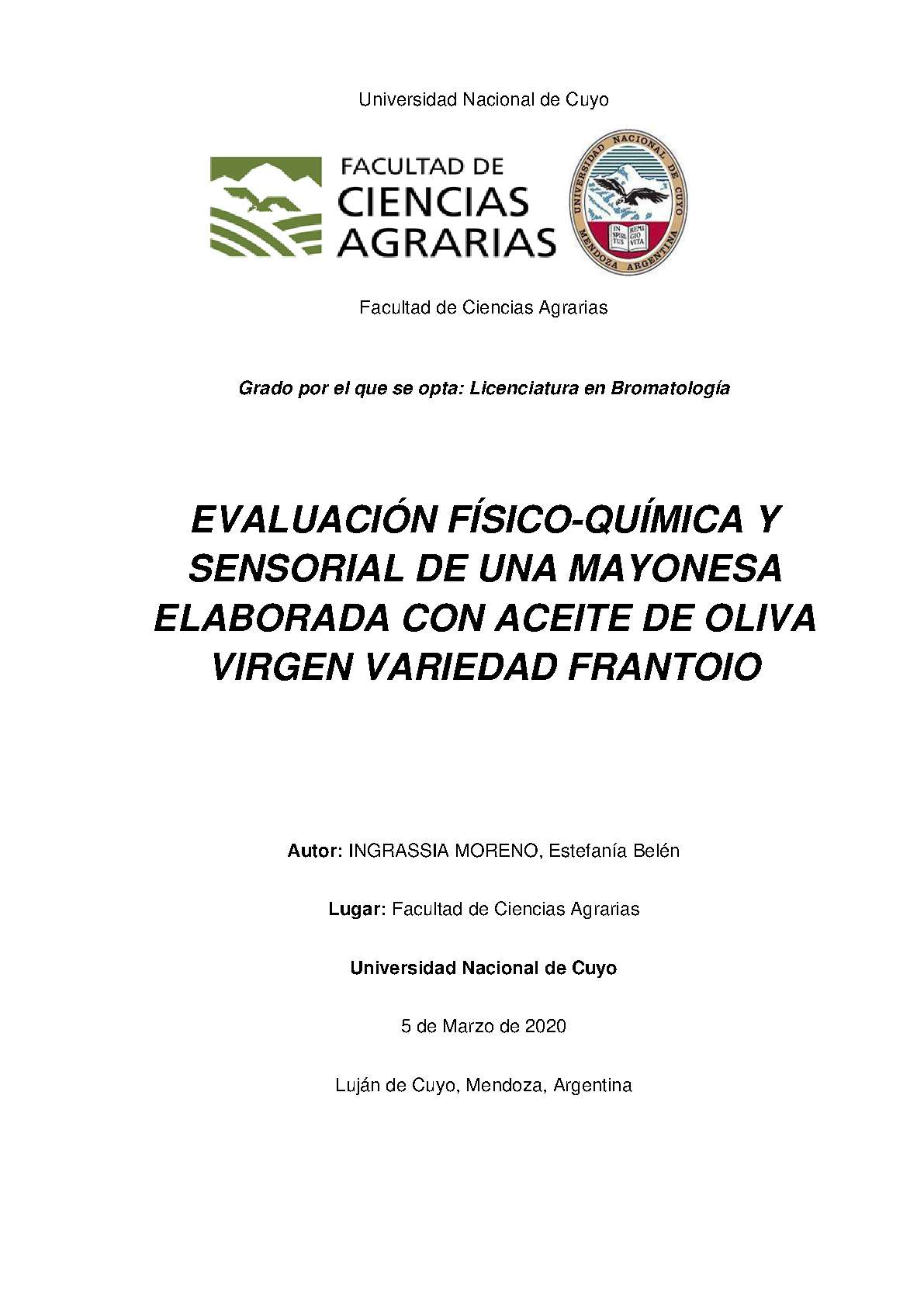 BIOTECNOLOGÍA - ACEITE DE OLIVA - EVALUACIÓN SENSORIAL DE LOS ALIMENTOS - ANÁLISIS ORGANOLÉPTICO - PROPIEDADES FISICOQUÍMICAS - MAYONESA - MENDOZA (ARGENTINA : PROVINCIA) - DESARROLLO DE UN PRODUCTO - ÁCIDOS GRASOS - POLIFENOLES