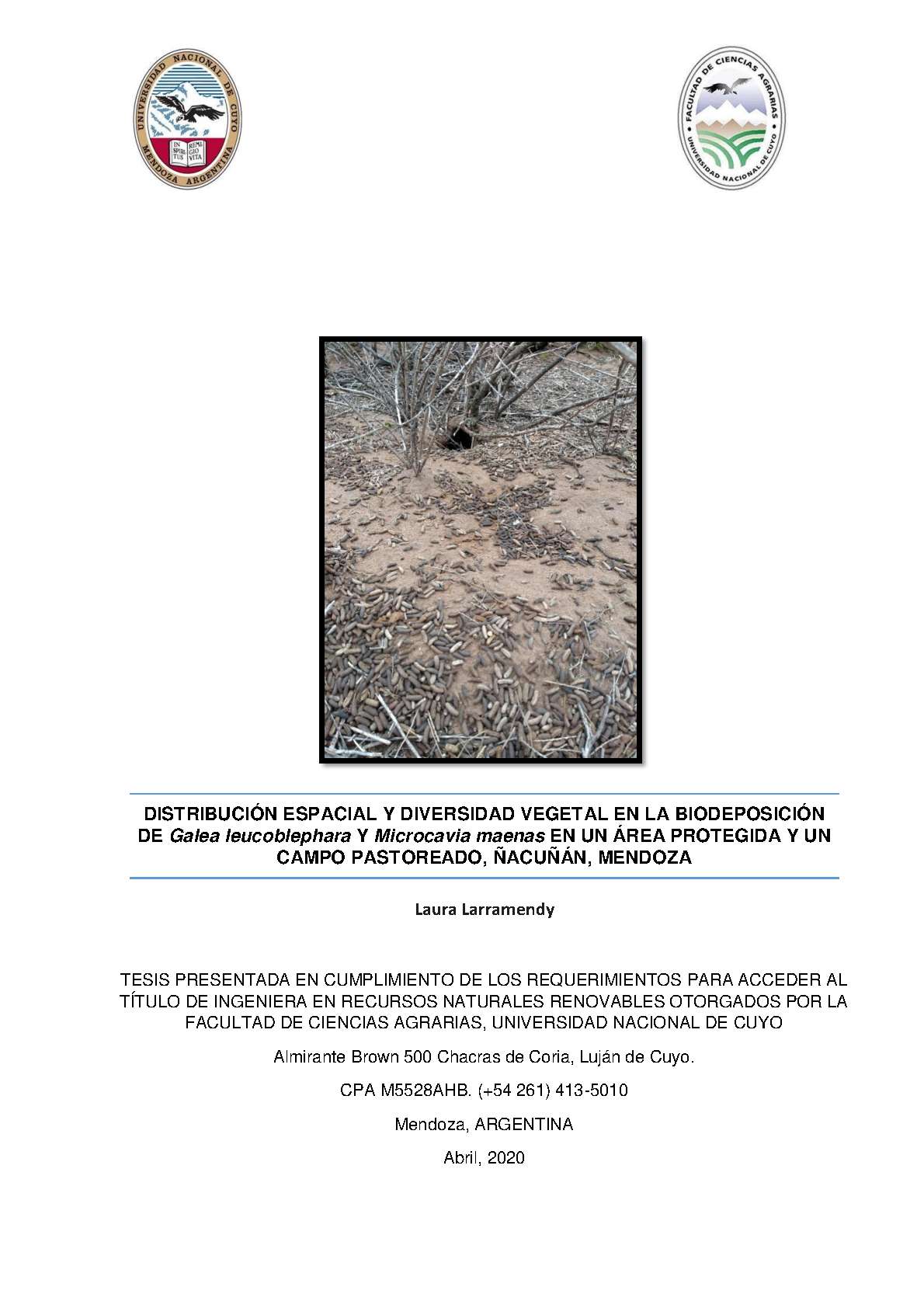 Distribución espacial y diversidad vegetal en la biodeposición de Galea leucoblephara y Microcavia maenas en un área protegida y un campo pastoreado, Ñacuñán, Mendoza