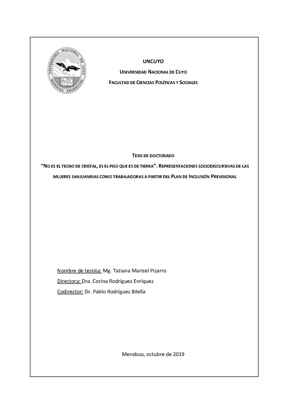 Pizarro, Tatiana Marisel. (2019). No es el techo de cristal, es el piso que es de tierra: representaciones sociodiscursivas de las mujeres sanjuaninas como trabajadoras a partir del Plan de Inclusión Previsional (Tesis de Doctorado). Mendoza, Universidad Nacional de Cuyo. Facultad de Ciencias Políticas y Sociales .
