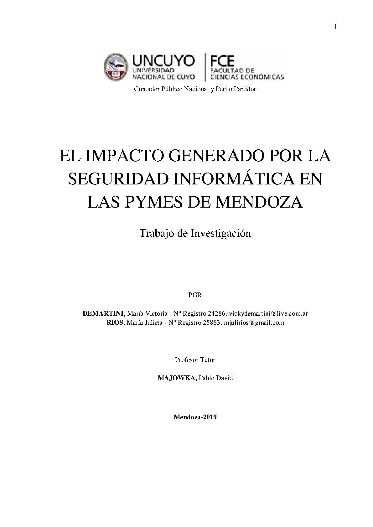 informática en Pymes de Mendoza, buscando como objetivo aportar información a entes analizados con el fin de implementar herramientas propuestas, concientizar respecto del impacto económico de la gestión de seguridad informática en la gestión empresarial y así poder detectar brechas y vulnerabilidades del sistema establecido y posibles oportunidades de mejora. Ayudará a las PYMES de Mendoza a tomar conciencia en la protección de sus datos y sistemas informáticos, teniendo en cuenta que cuando nos referimos a datos informáticos, es toda la información virtual que se encuentra
