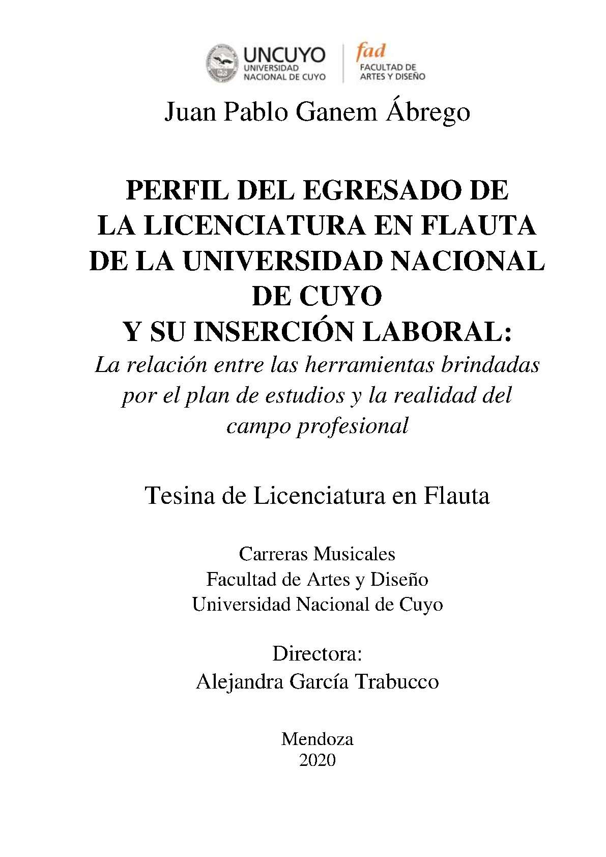 Se analiza el perfil del egresado de la Licenciatura en Flauta de la Universidad Nacional de Cuyo y su inserción laboral; enfocándose la relación entre las herramientas brindadas en los planes de estudio y las exigencias de un puesto de trabajo con especificidad en el campo del título obtenido, observada desde el punto de vista de un grupo de egresados y estudiantes avanzados de la carrera.