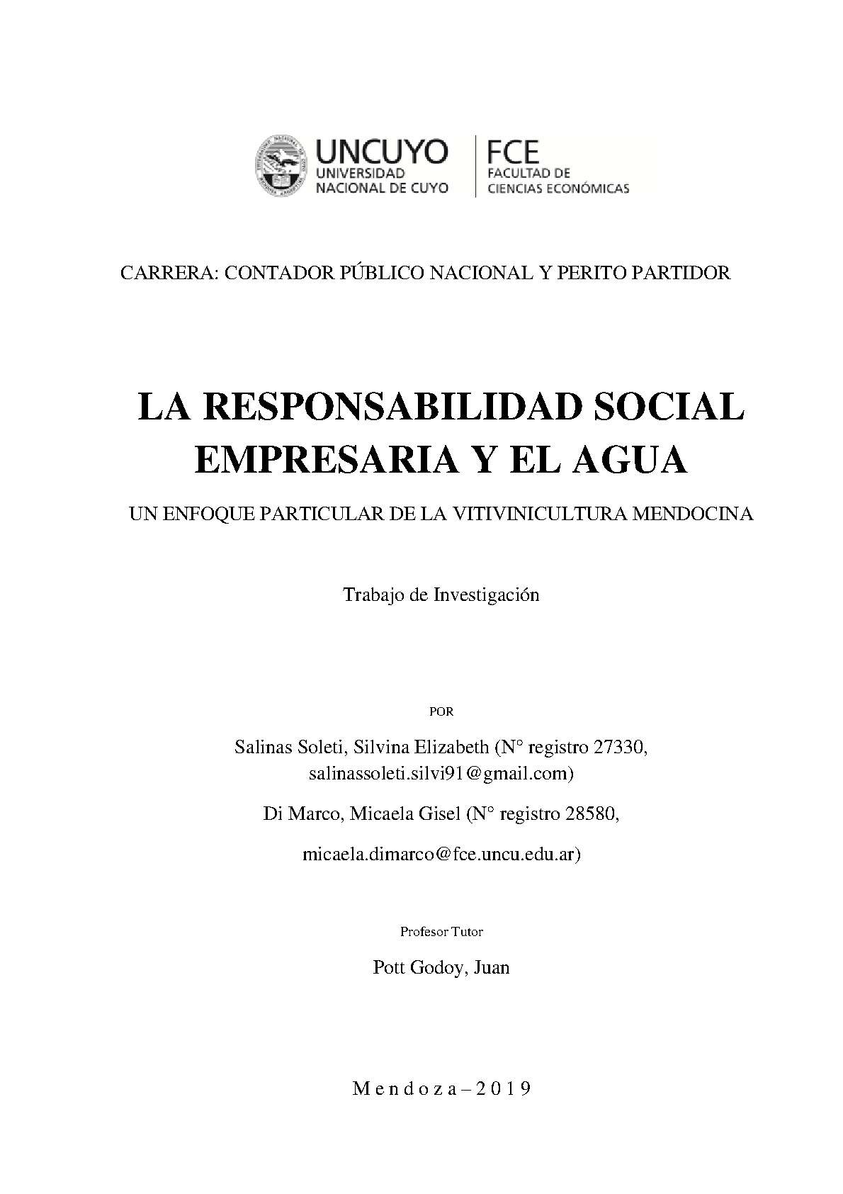 Se busca responder inquietudes sobre aspectos como: el uso del agua en las empresas mendocinas, analizando sus posibilidades de contribuir a las prácticas de RSE; la conciencia de la comunidad sobre su consumo y el desarrollo de alternativas para el empleo responsable del recurso, como de técnicas para reducir su uso; con el análisis de los beneficios de su aplicación en el agua para la vitivinicultura.