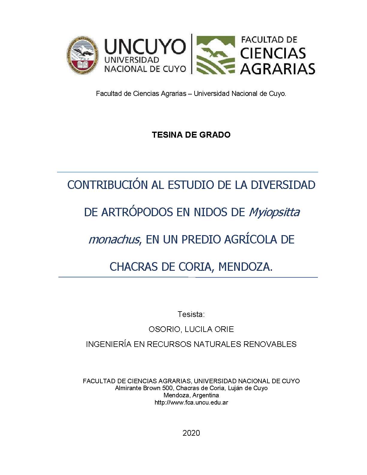 Contribución al estudio de la diversidad de artrópodos en nidos de Myiopsitta monachus, en un predio agrícola de Chacras de Coria, Mendoza