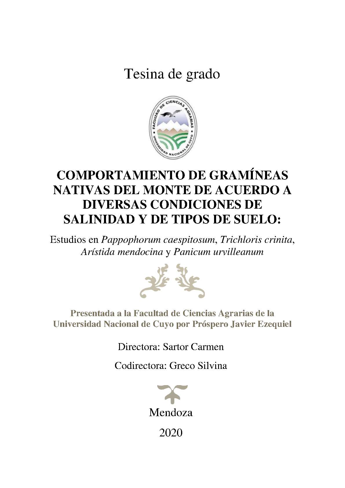 Entendiendo lo mencionado, la presente tesis tuvo como objetivo seleccionar especies de gramíneas perennes con uso potencial para restauración, de acuerdo a su comportamiento en diferentes condiciones edáficas y de salinidad presentes en nuestra provincia. Para esto se evaluó el porcentaje de emergencia y crecimiento de las gramíneas perennes nativas Trichloris crinita (variedad 10 y 13), Pappophorum caespitosum, Panicum urvilleanum y Aristida mendocina en suelos de diferentes texturas encontrados en ambientes degradados en Mendoza (arcillosa, ripiosa y arenosa) y bajo condiciones de riegos con solución salina a distintas concentraciones.