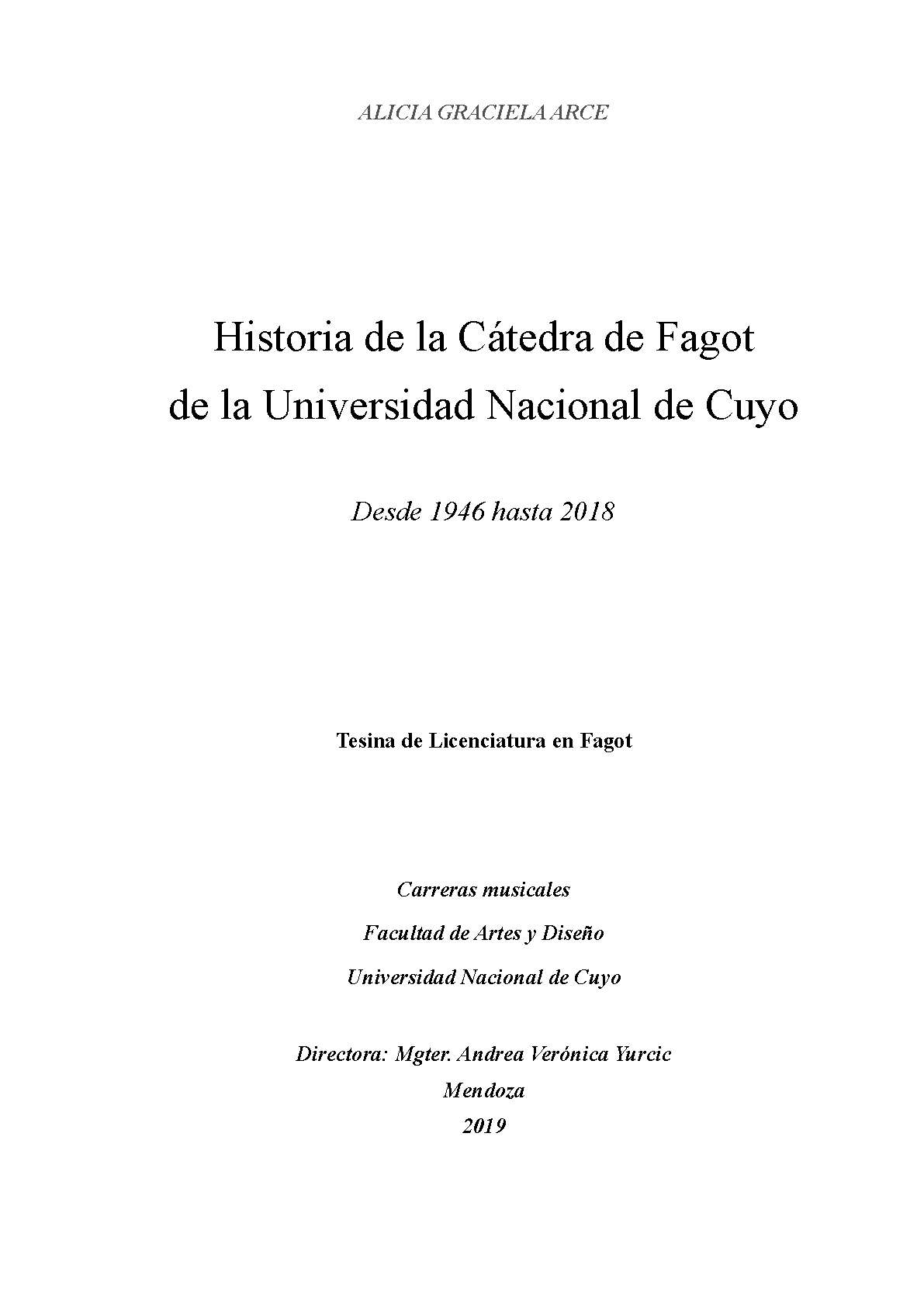 Arce, Alicia Graciela. (2019). Historia de la Cátedra de Fagot de la Universidad Nacional de Cuyo: desde 1946 hasta 2018 (Tesina de grado). Mendoza, Universidad Nacional de Cuyo. Facultad de Artes y Diseño .