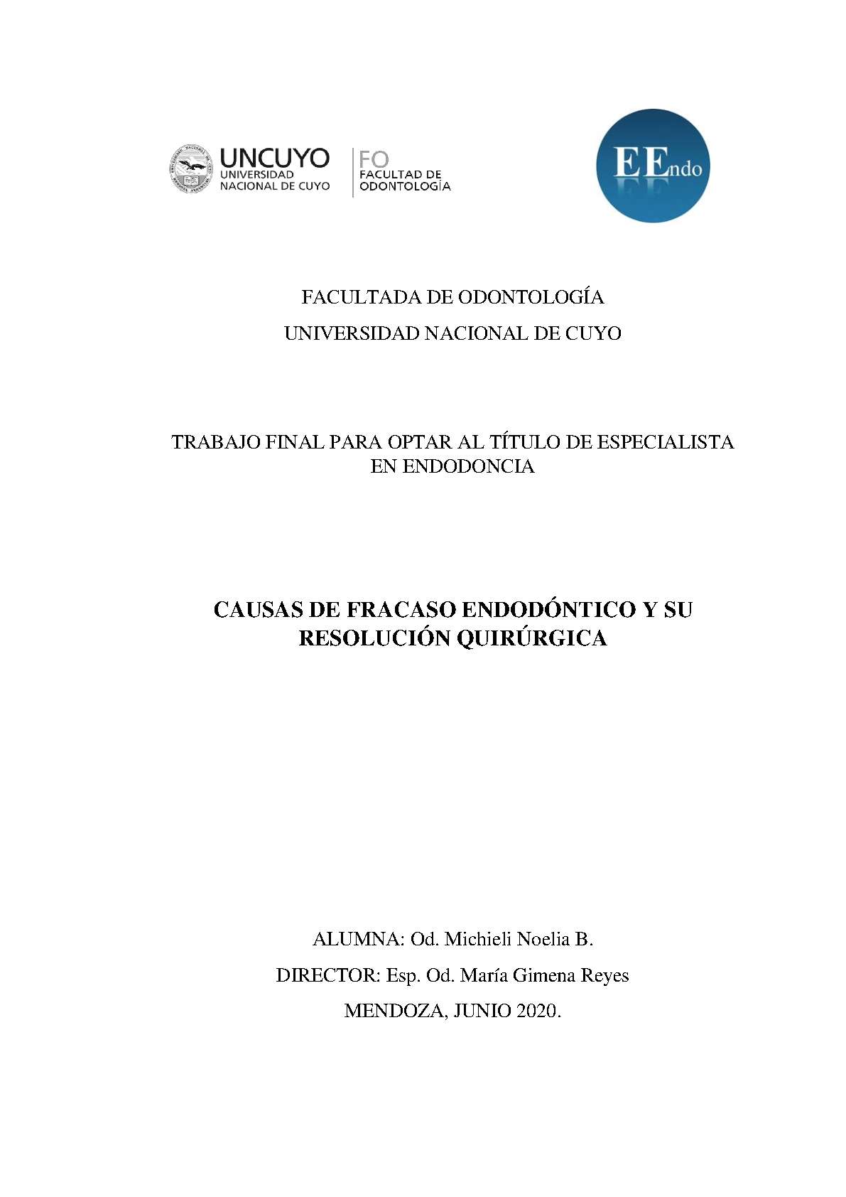Michieli, Noelia B.. (2020). Causas de fracaso endodóntico y su resolución quirúrgica : (Trabajo final de especialización). Mendoza, Universidad Nacional de Cuyo. Facultad de Odontología .