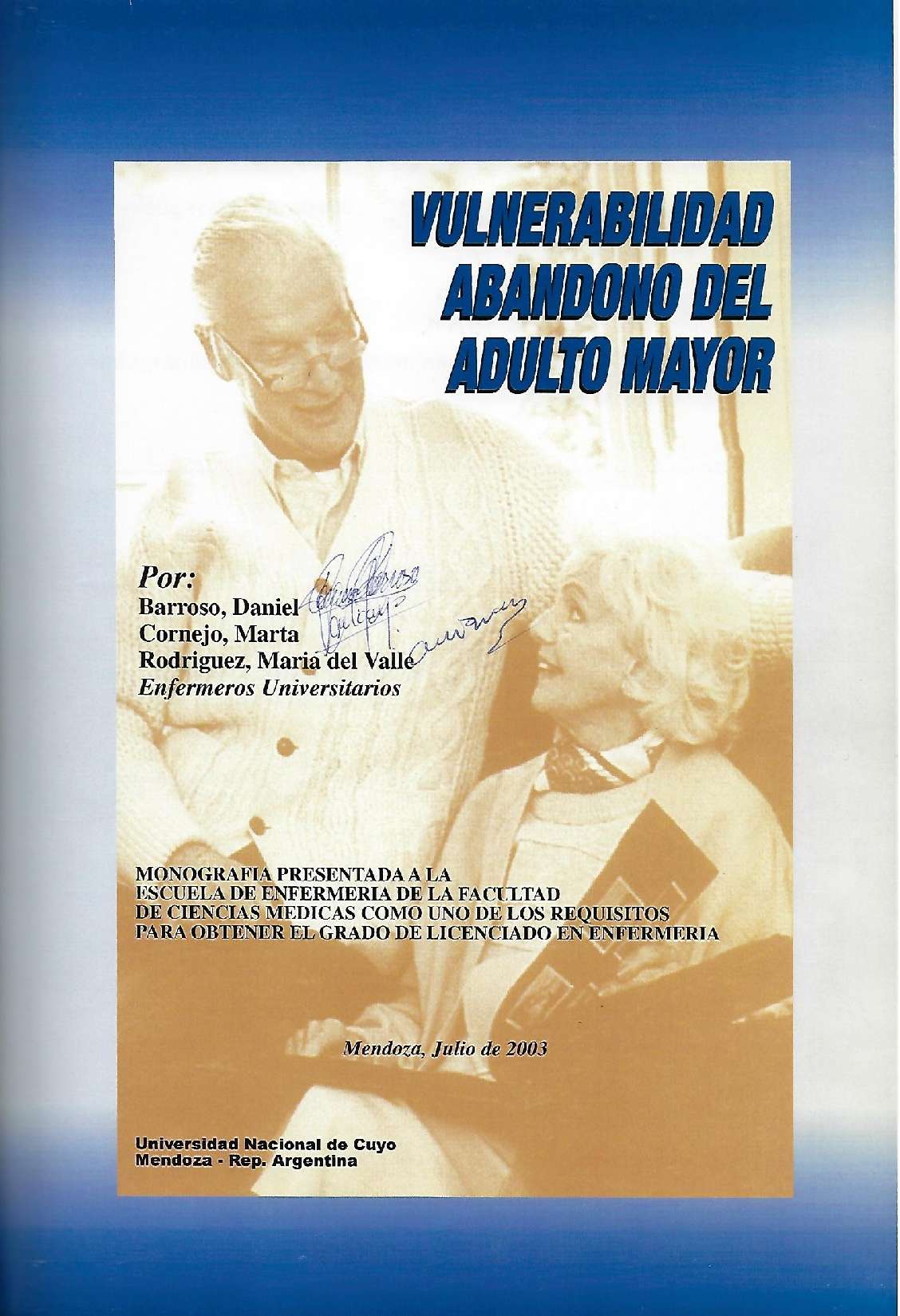 La ancianidad, en la actualidad, es considerada una etapa indeseable en la vida de las personas, y los viejos reciben en muchos casos, un tratamiento que desconoce su valor como seres humanos. Se entiende por abandono, la acción y efecto de abandonar, dejar sin amparo a una persona, con indolencia, con descuido. Se observa en la práctica cotidiana del personal de enfermería en las instituciones del estado y privadas, un alto porcentaje de ancianos institucionalizados abandonados por sus familiares. Dicho acto conlleva a un progresivo deterioro de la calidad de vida de estos, que se ve reflejado no sólo en lo físico sino también en lo psíquico, padeciendo patologías agregadas al proceso natural de envejecimiento, que en muchos casos lleva a dejar postrados a los pacientes hasta la muerte de los mismos. El profesional de enfermería necesita una capacitación gerontológica, que le permitirá tener una visión integral del anciano y su entorno; desarrollando estrategias de intervención adecuadas a las necesidades del paciente. El presente trabajo de investigación tiene como objetivo determinar cuál es el grado de vulnerabilidad de abandono de los adultos mayores en las instituciones asilares, San Vicente de Paul y Santa Marta, de la ciudad de Mendoza, en el año 2003. Es un estudio de tipo cuantitativo, descriptivo y comparativo, en el cual se utilizó como método de recolección de datos entrevistas directas a los ancianos en estudio.