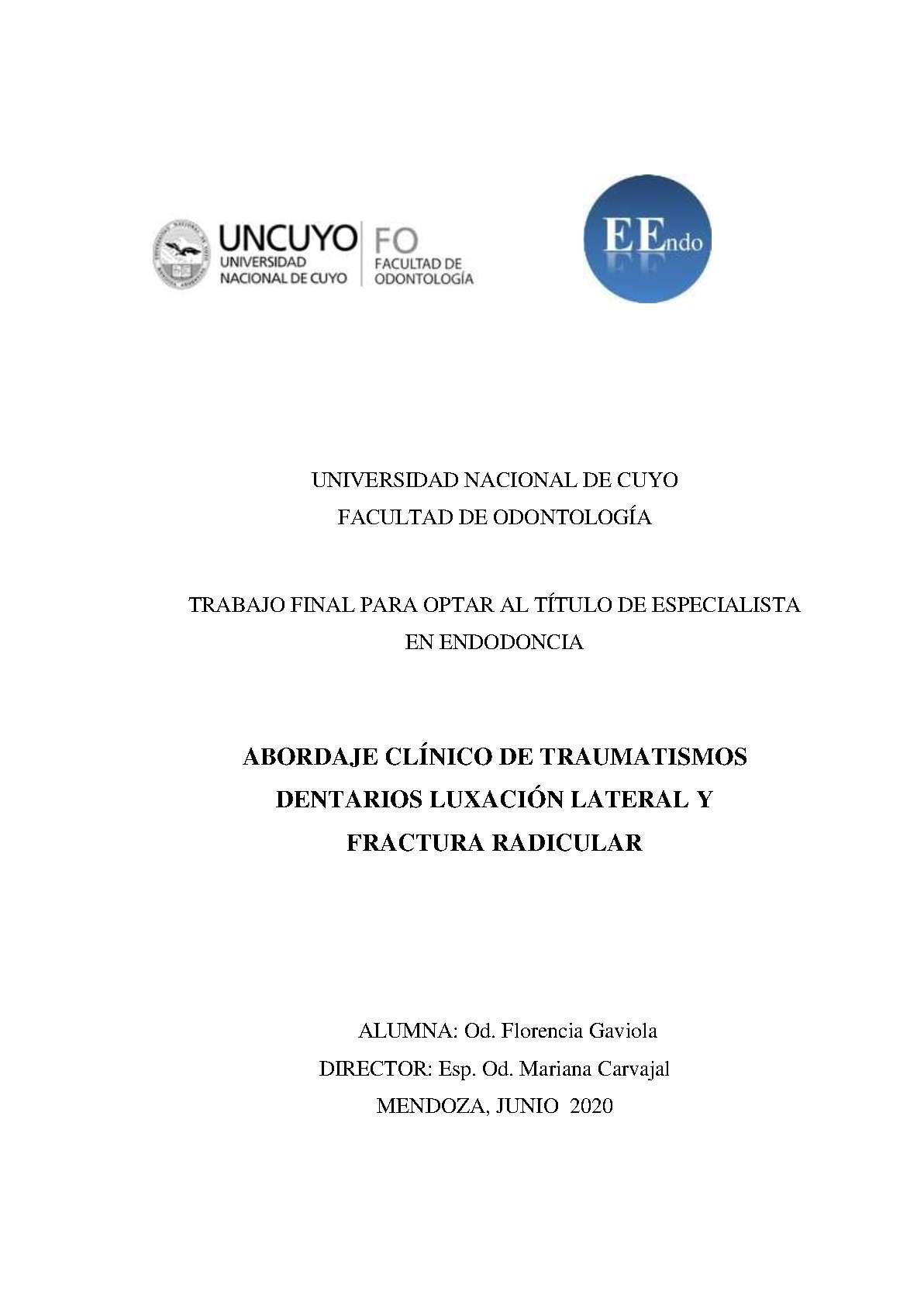 Los traumatismos dentarios ocupan, por su frecuencia, un lugar relevante en la consulta odontológica cotidiana. Algunos de ellos, como las luxaciones, afectan principalmente a los tejidos de soporte del diente. Las luxaciones de tipo lateral pueden provocar múltiples lesiones debido al daño que se produce tanto en la corona y en la raíz del diente, como así también en el ligamento periodontal, cemento y hueso alveolar. La respuesta del organismo ante una lesión de este tipo puede ser la necrosis estéril (sin presencia de bacterias), necrosis relacionada con la infección (con filtración bacteriana) o la revascularización, regeneración o reparación de la pulpa traumatizada.
