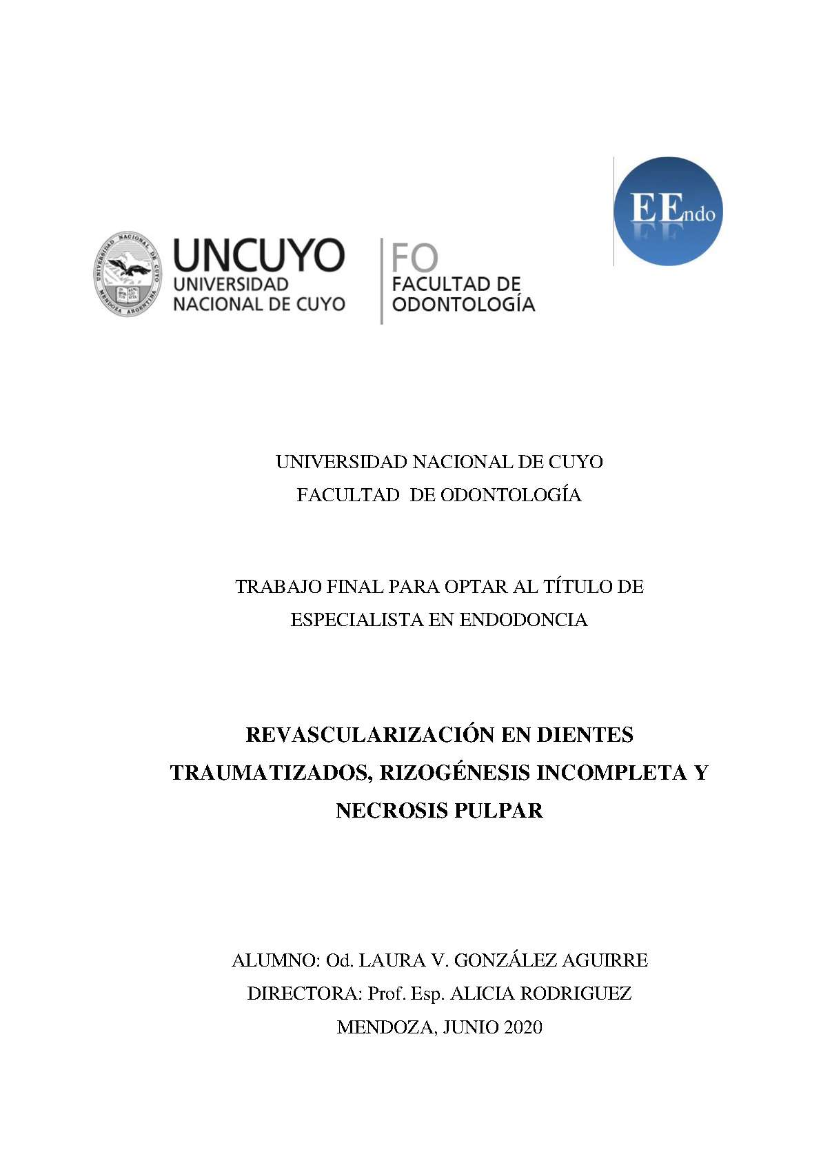 González Aguirre, Laura V.. (2020). Revascularización en dientes traumatizados, rizogénesis incompleta y necrosis pulpar : (Trabajo final de especialización). Mendoza, Universidad Nacional de Cuyo. Facultad de Odontología .