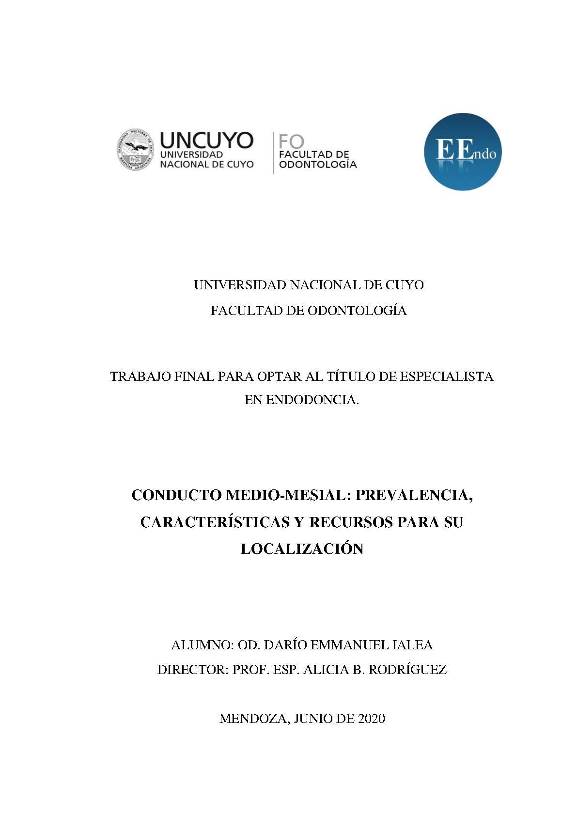Ialea, Darío E.. (2020). Conducto medio-mesial : prevalencia, características y recursos para su localización (Trabajo final de especialización). Mendoza, Universidad Nacional de Cuyo. Facultad de Odontología .